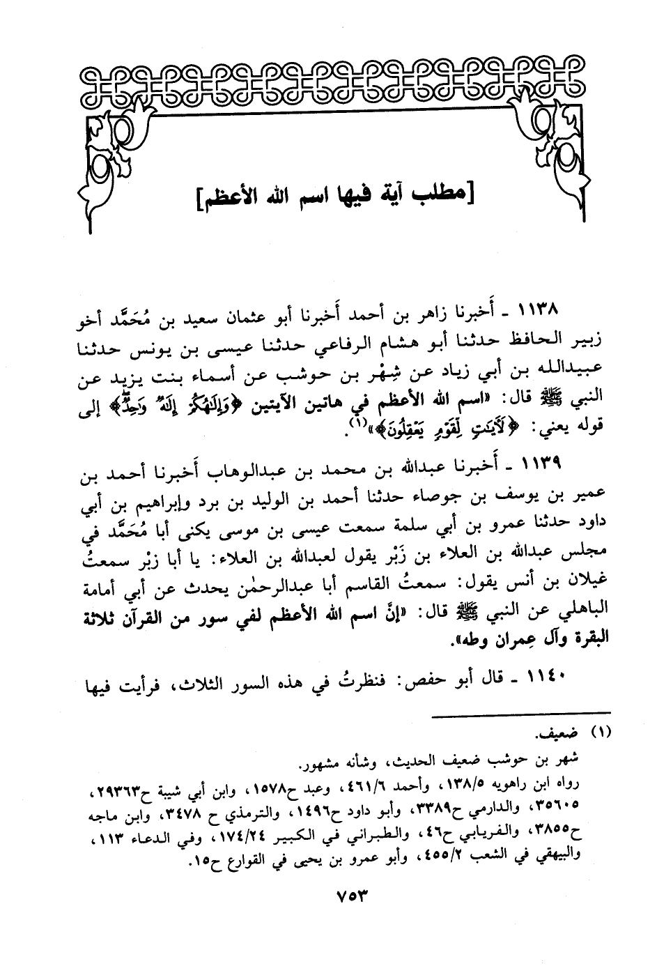 1138- أخبرنا زاهر بن أحمد أخبرنا أبو عثمان سعيد بن محمد أخو زبير الحافظ حدثنا أبو هشام الرفاعي حدثنا عيسى بن يونس حدثنا عبيد الله بن أبي زياد عن شهر بن حوشب عن أسماء بنت يزيد عن النبي صلى الله عليه وسلم قال: اسم الله الأعظم في هاتين الآيتين {وإلهكم إله واحد} إلى قوله يعني: {لأيات لقوم يعقلون} .