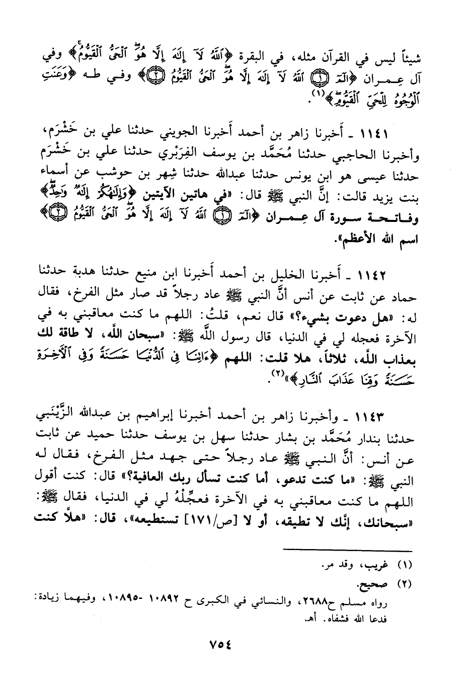 1142- أخبرنا الخليل بن أحمد أخبرنا ابن منيع حدثنا هدبة حدثنا حماد عن ثابت عن أنس أن النبي صلى الله عليه وسلم عاد رجلا قد صار مثل الفرخ فقال له: هل دعوت بشيء؟ قال: نعم قلت: اللهم ما كنت معاقبني به في الآخرة فعجله لي في الدنيا قال رسول الله صلى الله عليه وسلم: سبحان الله لا طاقة لك بعذاب الله ثلاثا هلا قلت: اللهم {ءاتنا في الدنيا حسنة وفي الآخرة حسنة وقنا عذاب النار} .