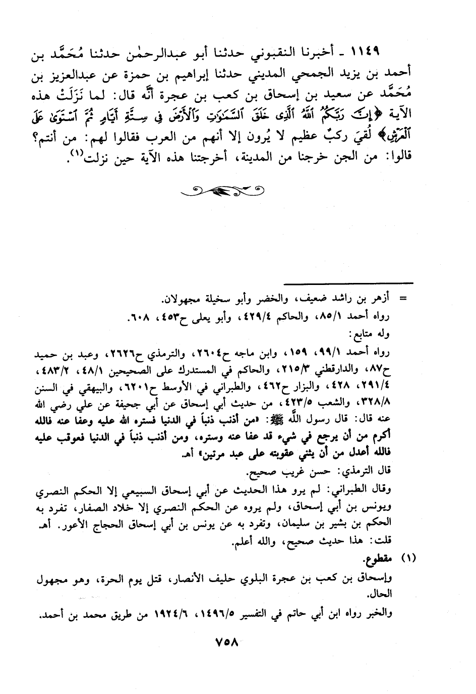 1149- أخبرنا النقبوني حدثنا أبو عبد الرحمن حدثنا محمد بن أحمد بن يزيد الجمحي المديني حدثنا إبراهيم بن حمزة، عَن عَبد العزيز بن محمد عن سعيد بن إسحاق بن كعب بن عجرة أنه قال: لما نزلت هذه الآية {إن ربكم الله الذي خلق السموات والأرض في ستة أيام ثم استوى على العرش} لقي ركب عظيم لا يرون إلا أنهم من العرب فقالوا لهم: من أنتم؟ قالوا: من الجن خرجنا من المدينة أخرجتنا هذه الآية حين نزلت.