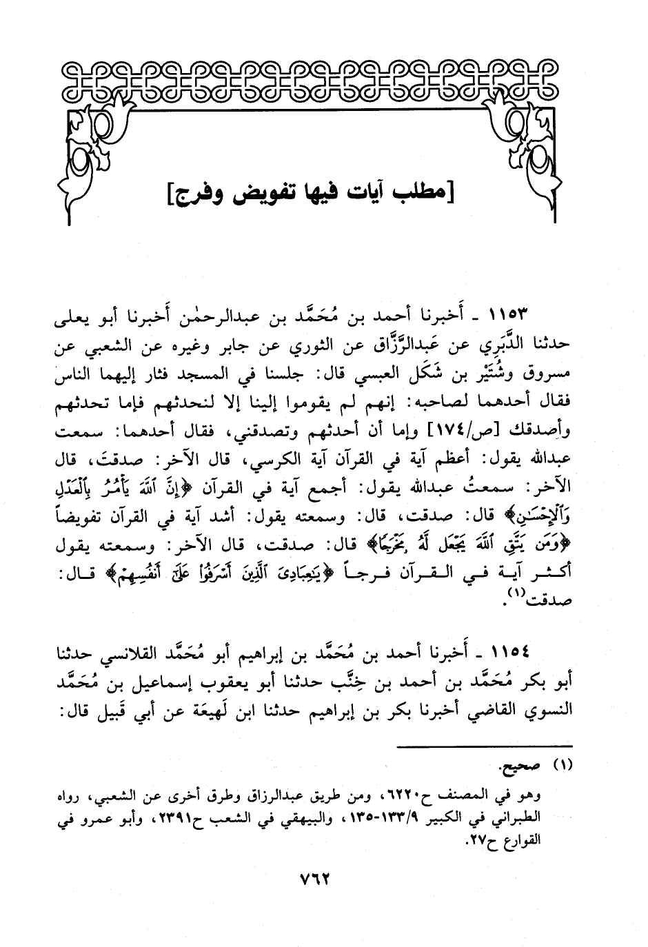 1153- أخبرنا أحمد بن محمد بن عبد الرحمن أخبرنا أبو يعلى حدثنا الدبري، عَن عَبد الرزاق عن الثوري عن جابر وغيره عن الشعبي عن مسروق وشتير بن شكل العبسي قال: جلسنا في المسجد فثار إليهما الناس فقال أحدهما لصاحبه: إنهم لم يقوموا إلينا إلا لنحدثهم فإما تحدثهم وأصدقك وإما أن أحدثهم وتصدقني فقال أحدهما: سمعت عبد الله يقول: أعظم آية في القرآن آية الكرسي قال الآخر: صدقت قال الآخر: سمعت عبد الله يقول: أجمع آية في القرآن {إن الله يأمر بالعدل والإحسان} قال: صدقت قال: وسمعته يقول: أشد آية في القرآن تفويضا {ومن يتق الله يجعل له مخرجا} قال: صدقت قال الآخر: وسمعته يقول أكثر آية في القرآن فرجا {ياعبادي الذين أسرفوا على أنفسهم} قال: صدقت.