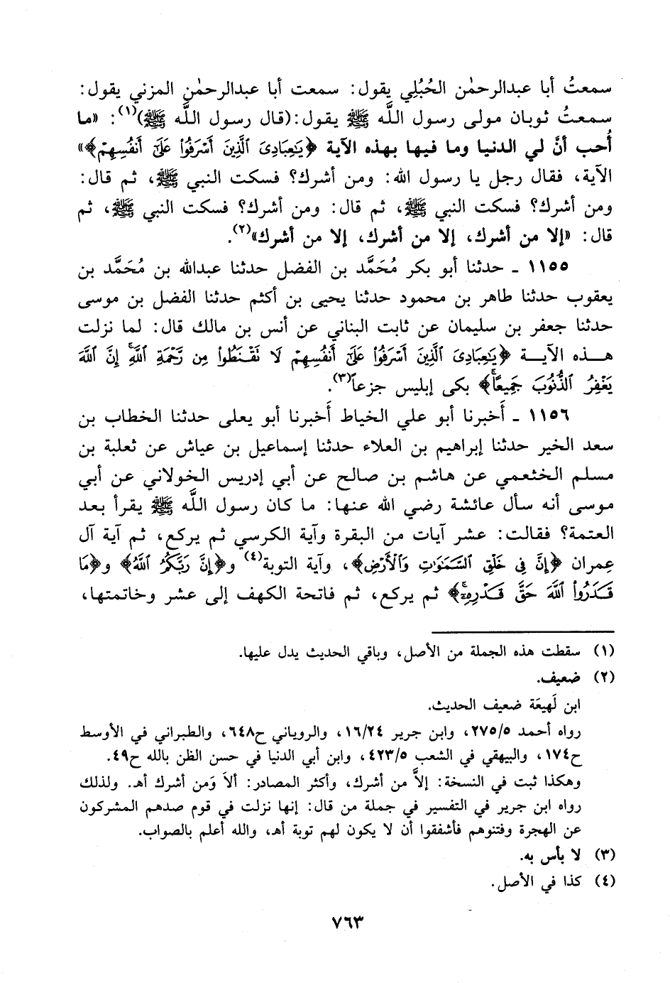 1155- حدثنا أبو بكر محمد بن الفضل حدثنا عبد الله بن محمد بن يعقوب حدثنا طاهر بن محمود حدثنا يحيى بن أكثم حدثنا الفضل بن موسى حدثنا جعفر بن سليمان عن ثابت البناني عن أنس بن مالك قال: لما نزلت هذه الآية {ياعبادي الذين أسرفوا على أنفسهم لا تقنطوا من رحمة الله إن الله يغفر الذنوب جميعا} بكى إبليس جزعا.