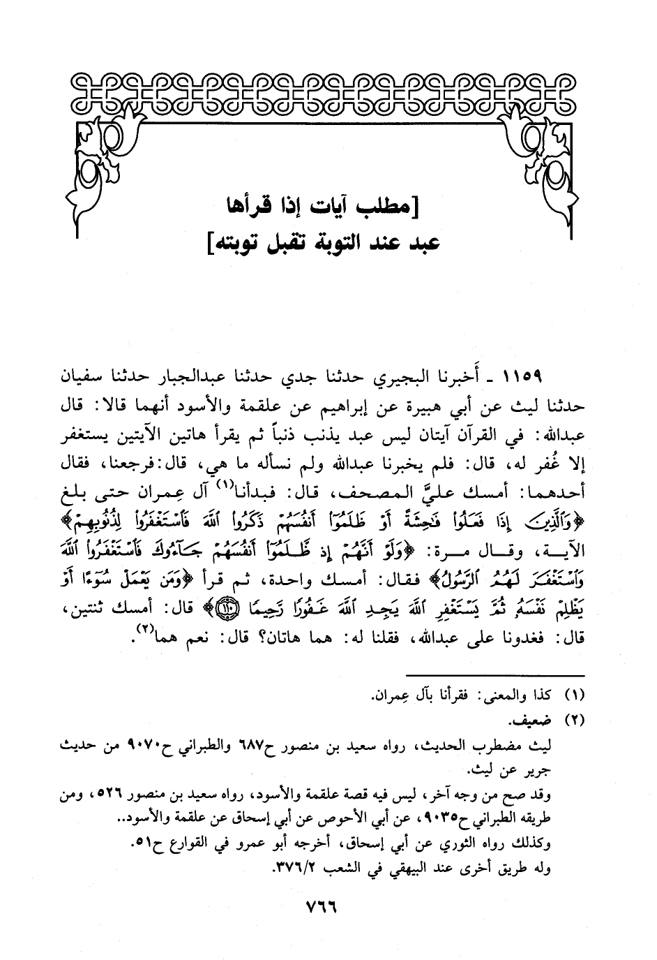 1159- أخبرنا البجيري حدثنا جدي حدثنا عبد الجبار حدثنا سفيان حدثنا ليث، عَن أبي هبيرة عن إبراهيم عن علقمة والأسود أنهما قالا: قال عبد الله: في القرآن آيتان ليس عبد يذنب ذنبا ثم يقرأ هاتين الآيتين يستغفر إلا غفر له قال: فلم يخبرنا عبد الله ولم نسأله ما هي قال: فرجعنا فقال أحدهما: أمسك علي المصحف قال: فبدأنا آل عمران حتى بلغ {والذين إذا فعلوا فاحشة أو ظلموا أنفسهم ذكروا الله فاستغفروا لذنوبهم} الآية وقال مرة: {ولو أنهم إذ ظلموا أنفسهم جاءوك فاستغفروا الله واستغفر لهم الرسول} فقال: أمسك واحدة ثم قرأ {ومن يعمل سوءا أو يظلم نفسه ثم يستغفر الله يجد الله غفورا رحيما} قال: أمسك ثنتين قال: فغدونا على عبد الله فقلنا له: هما هاتان؟ قال: نعم هما.