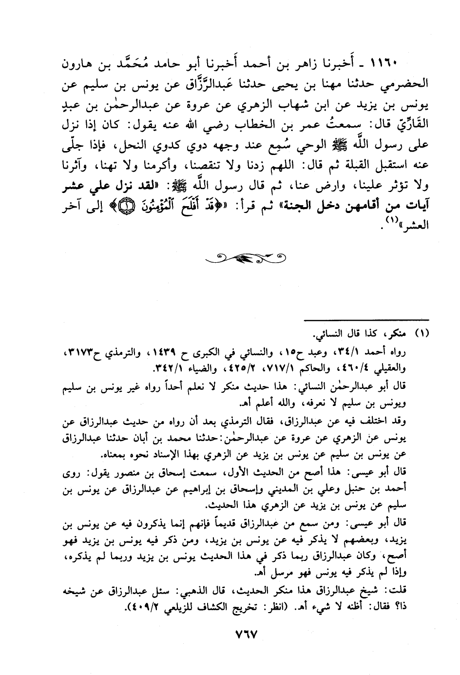 1160- أخبرنا زاهر بن أحمد أخبرنا أبو حامد محمد بن هارون الحضرمي حدثنا مهنا بن يحيى حدثنا عبد الرزاق عن يونس بن سليم عن يونس بن يزيد عن ابن شهاب الزهري عن عروة، عَن عَبد الرحمن بن عبد القاري قال: سمعت عمر بن الخطاب رضي الله عنه يقول: كان إذا نزل على رسول الله صلى الله عليه وسلم الوحي سمع عند وجهه دوي كدوي النحل فإذا جلى عنه استقبل القبلة ثم قال: اللهم زدنا، ولاَ تنقصنا وأكرمنا، ولاَ تهنا وآثرنا، ولاَ تؤثر علينا وارض عنا ثم قال رسول الله صلى الله عليه وسلم: لقد نزل علي عشر آيات من أقامهن دخل الجنة ثم قرأ {قد أفلح المؤمنون} إلى آخر العشر.