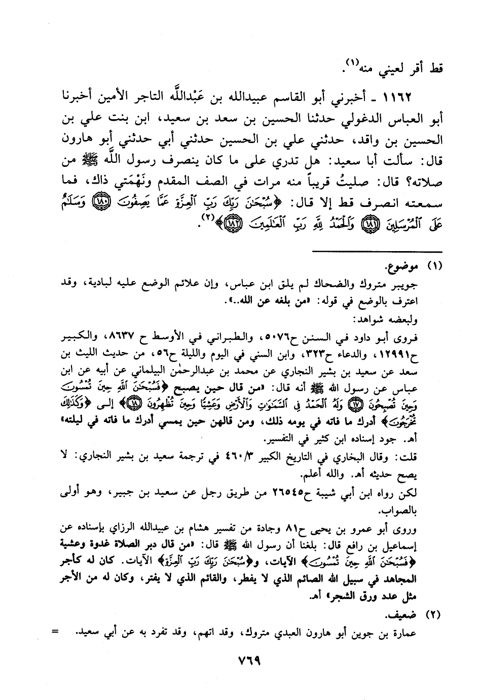 1162- أخبرني أبو القاسم عبيد الله بن عبد الله التاجر الأمين أخبرنا أبو العباس الدغولي حدثنا الحسين بن سعد بن سعيد ابن بنت علي بن الحسين بن واقد حدثني علي بن الحسين حدثني أبي حدثني أبو هارون قال: سألت أبا سعيد: هل تدري على ما كان ينصرف رسول الله صلى الله عليه وسلم من صلاته؟ قال: صليت قريبا منه مرات في الصف المقدم ونهمتي ذاك فما سمعته انصرف قط إلا قال {سبحان ربك رب العزة عما يصفون. وسلام على المرسلين. والحمد لله رب العالمين} .