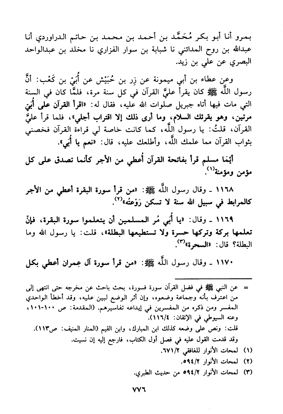 1170- وقال رسول الله صلى الله عليه وسلم: من قرأ سورة آل عمران أعطي بكل -[777]- آية منها أمانا على جسر جهنم.