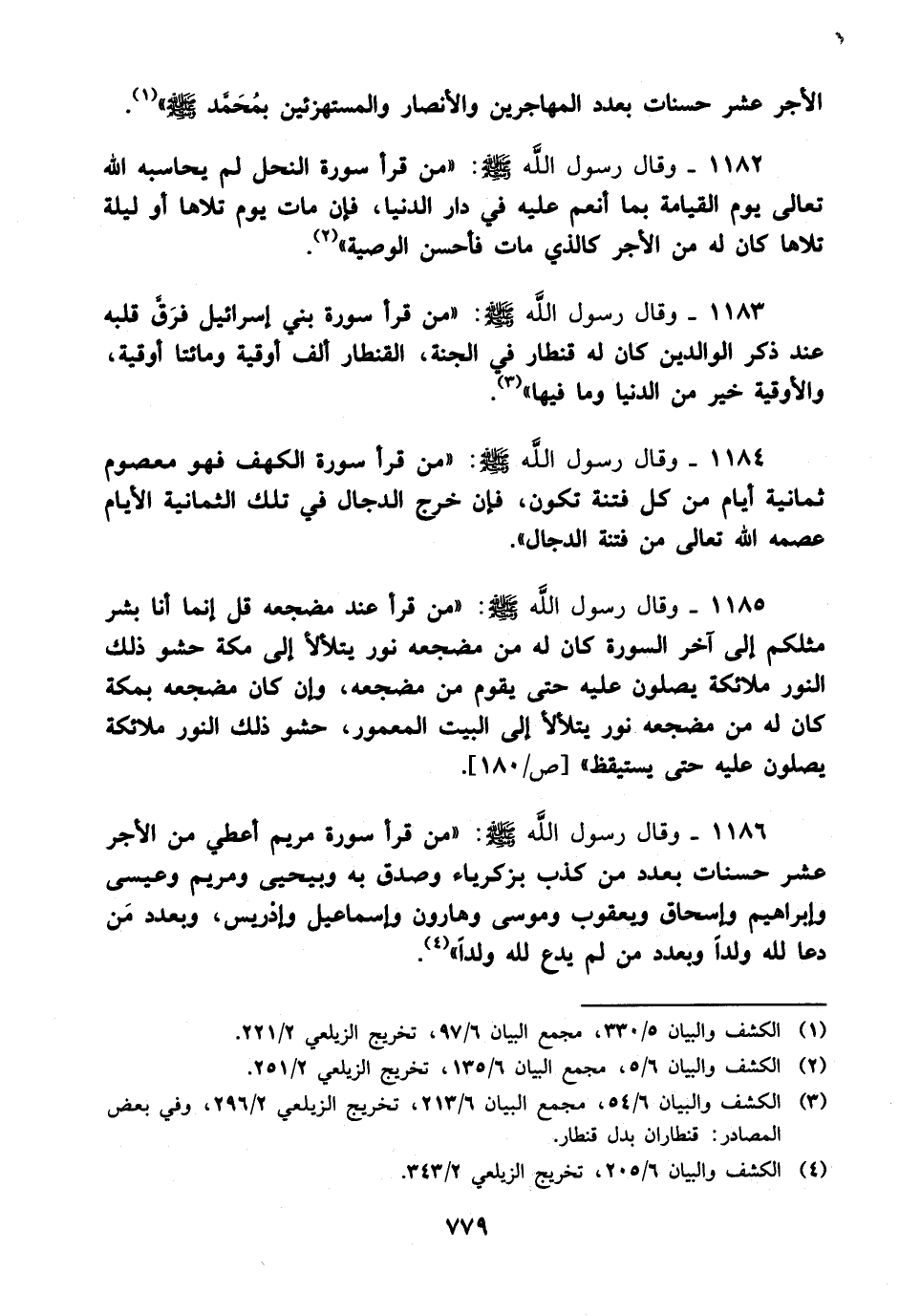 1183- وقال رسول الله صلى الله عليه وسلم: من قرأ سورة بني إسرائيل فرق قلبه عند ذكر الوالدين كان له قنطار في الجنة القنطار ألف أوقية ومائتا أوقية والأوقية خير من الدنيا وما فيها.