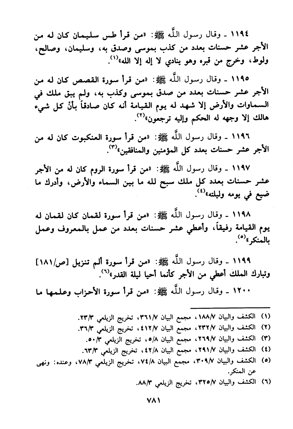 1194- وقال رسول الله صلى الله عليه وسلم: من قرأ طس سليمان كان له من الأجر عشر حسنات بعدد من كذب بموسى وصدق به وسليمان وصالح ولوط وخرج من قبره وهو ينادي لا إله إلا الله.