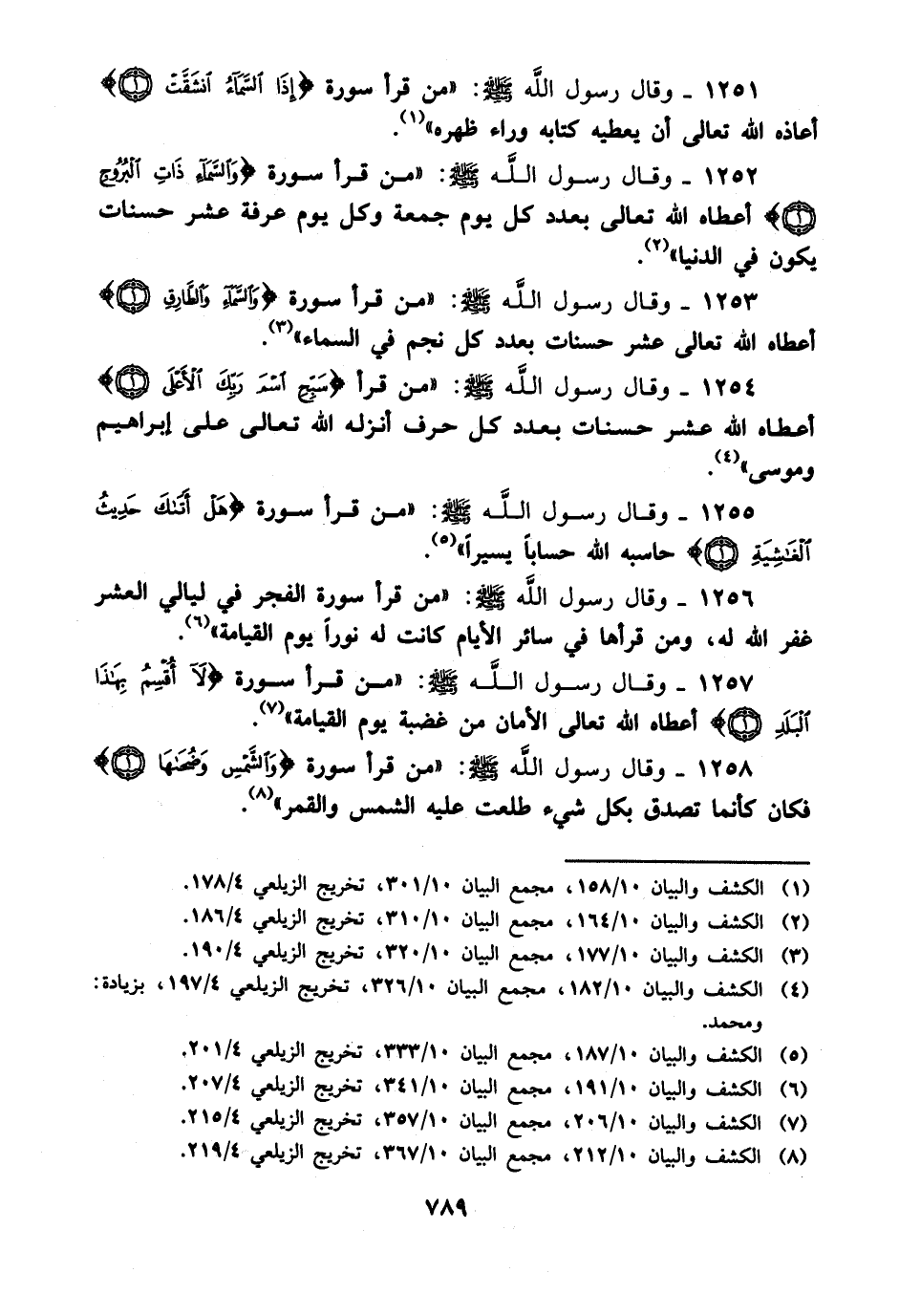 1256- وقال رسول الله صلى الله عليه وسلم: من قرأ سورة الفجر في ليالي العشر غفر الله له، وَمن قرأها في سائر الأيام كانت له نورا يوم القيامة.