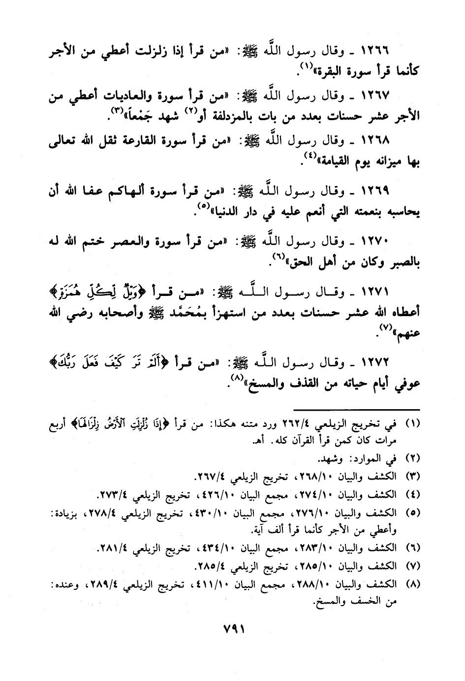 1271- وقال رسول الله صلى الله عليه وسلم: من قرأ {ويل لكل همزة} أعطاه الله عشر حسنات بعدد من استهزأ بمحمد صلى الله عليه وسلم وأصحابه رضي الله عنهم.