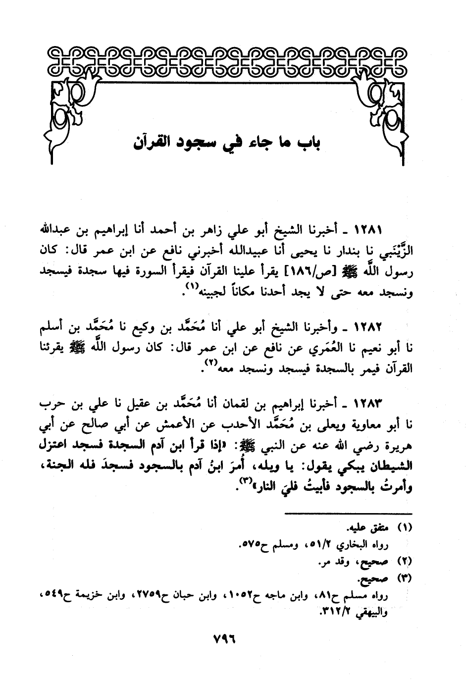 1281- أخبرنا الشيخ أبو علي زاهر بن أحمد، أخْبَرَنا إبراهيم بن عبد الله الزينبي، حَدَّثَنا بندار، حَدَّثَنا يحيى، أَخْبَرَنا عبيد الله أخبرني نافع عن ابن عمر قال: كان رسول الله صلى الله عليه وسلم يقرأ علينا القرآن فيقرأ السورة فيها سجدة فيسجد ونسجد معه حتى لا يجد أحدنا مكانا لجبينه.