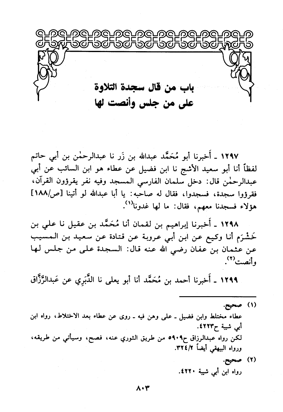 1297- أخبرنا أبو محمد عبد الله بن زر، حَدَّثَنا عبد الرحمن بن أبي حاتم لفظا، أخْبَرَنا أبو سعيد الأشج، حَدَّثَنا ابن فضيل عن عطاء هو ابن السائب، عَن أبي عبد الرحمن قال: دخل سلمان الفارسي المسجد وفيه نفر يقرؤون القرآن فقرؤوا سجدة فسجدوا فقال له صاحبه: ياأبا عبد الله لو أتينا هؤلاء فسجدنا معهم فقال: ما لها غدونا.