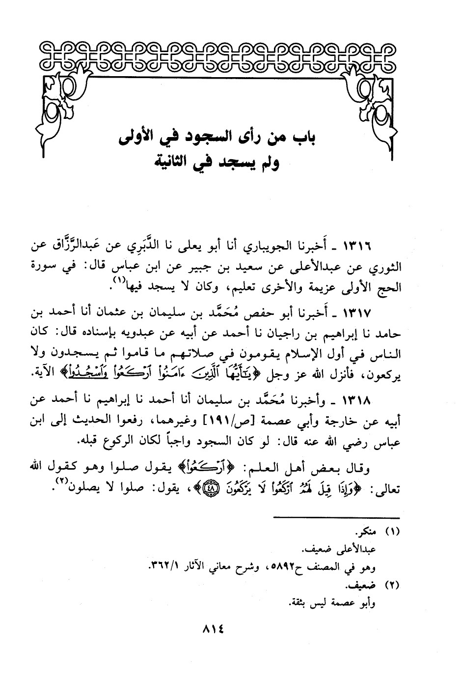 1316- أخبرنا الجويباري، أخْبَرَنا أبو يعلى، حَدَّثَنا الدبري، عَن عَبد الرزاق عن الثوري، عَن عَبد الأعلى عن سعيد بن جبير عن ابن عباس قال: في سورة الحج الأولى عزيمة والأخرى تعليم وكان لا يسجد فيها.