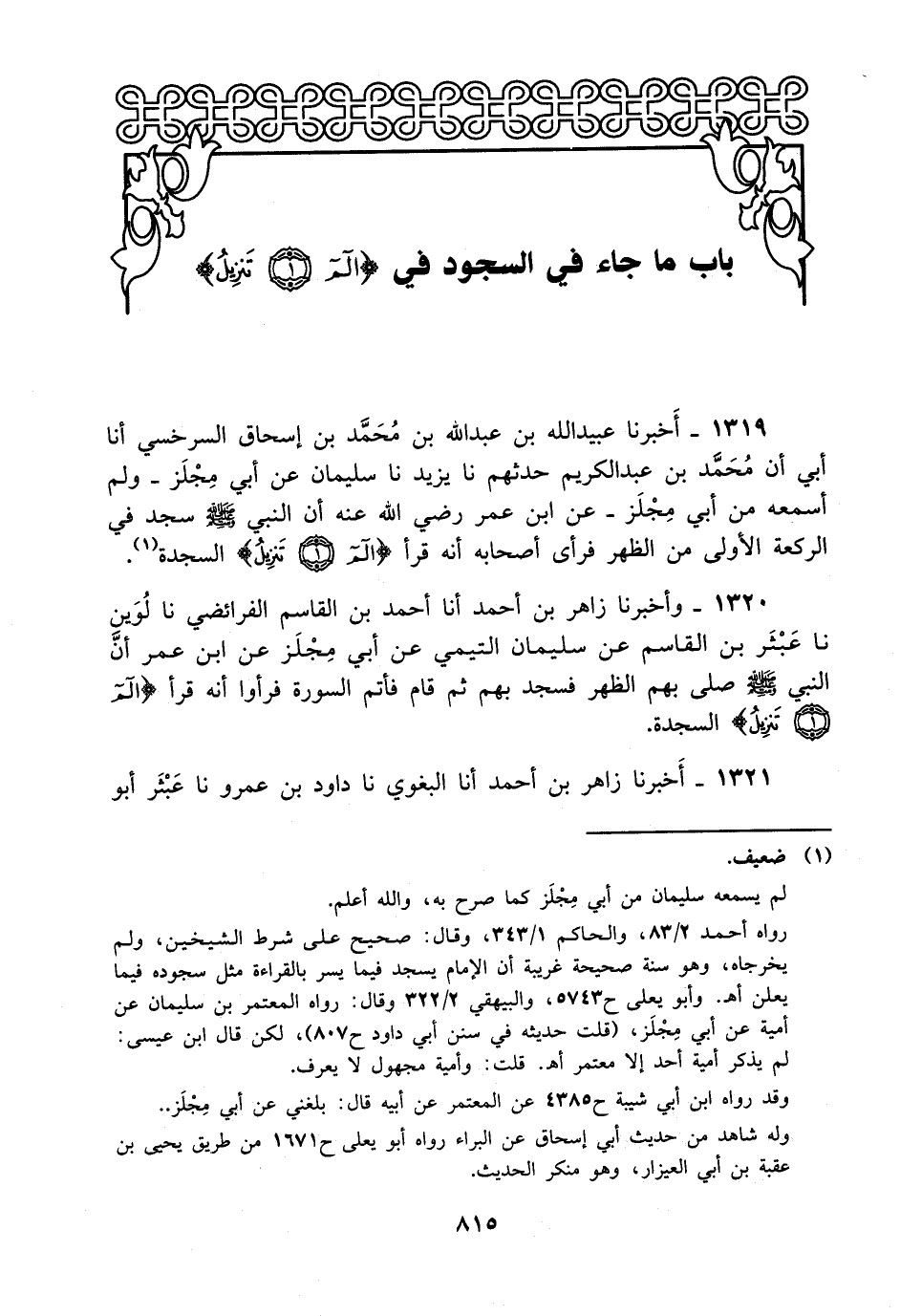 1319- أخبرنا عبيد الله بن عبد الله بن محمد بن إسحاق السرخسي، أَخْبَرَنا أبي أن محمد بن عبد الكريم حدثهم، حَدَّثَنا يزيد، حَدَّثَنا سليمان، عَن أبي مجلز - ولم أسمعه من أبي مجلز - عن ابن عمر رضي الله عنه أن النبي صلى الله عليه وسلم سجد في الركعة الأولى من الظهر فرأى أصحابه أنه قرأ {آلم. تنزيل} السجدة.