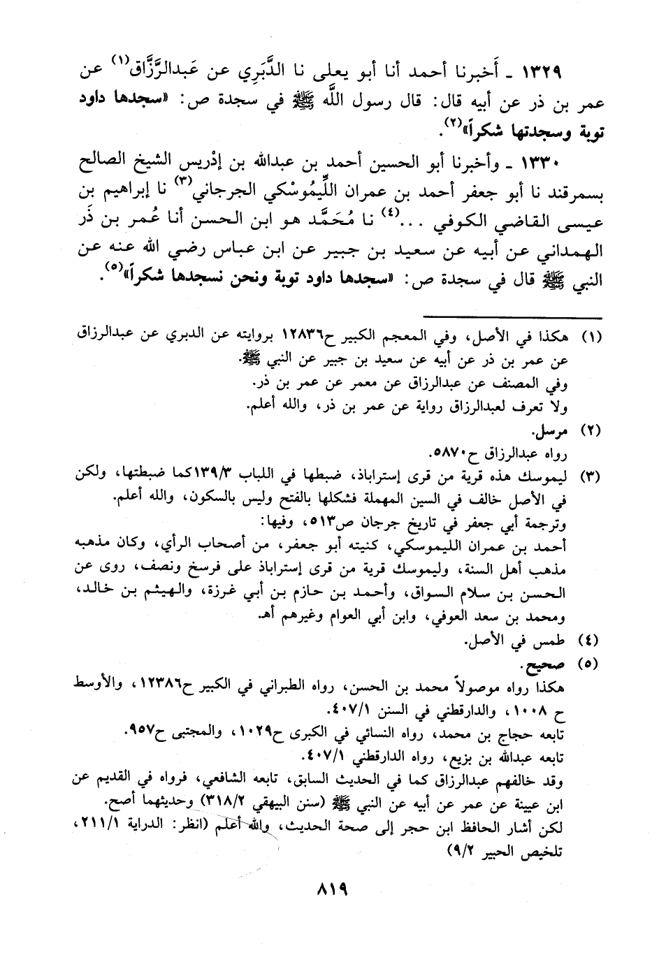 1330 - وأخبرنا أبو الحسين أحمد بن عبد الله بن إدريس الشيخ الصالح بسمرقند، حَدَّثَنا أبو جعفر أحمد بن عمران الليموسكي الجرجاني، حَدَّثَنا إبراهيم بن عيسى القاضي الكوفي....، حَدَّثَنا محمد هو ابن الحسن، أَخْبَرَنا عمر بن ذر الهمداني عن أبيه عن سعيد بن جبير عن ابن عباس رضي الله عنه عن النبي صلى الله عليه وسلم قال في سجدة ص: سجدها داود توبة ونحن نسجدها شكرا.