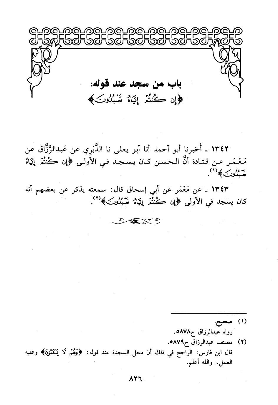 1342- أخبرنا أبو أحمد، أخْبَرَنا أبو يعلى، حَدَّثَنا الدبري، عَن عَبد الرزاق عن معمر عن قتادة أن الحسن كان يسجد في الأولى {إن كنتم إياه تعبدون} .