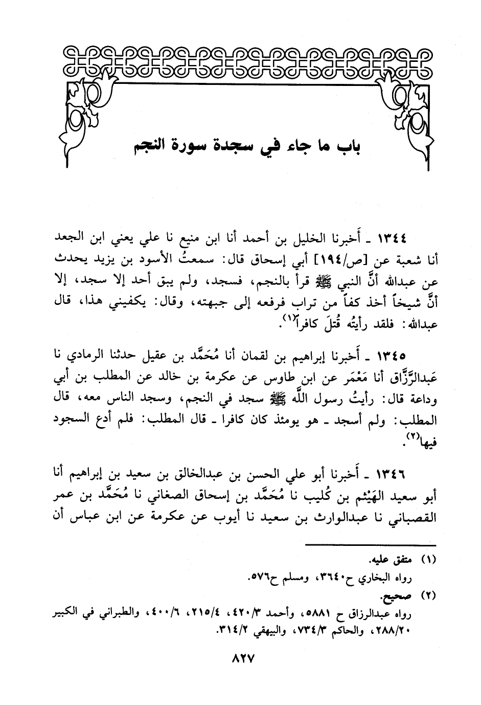 1344- أخبرنا الخليل بن أحمد، أَخْبَرَنا ابن منيع، حَدَّثَنا علي يعني ابن الجعد، أَخْبَرَنا شعبة، عَن أبي إِسحاق قال: سمعت الأسود بن يزيد يحدث، عَن عَبد الله أن النبي صلى الله عليه وسلم قرأ بالنجم فسجد ولم يبق أحد إلا سجد إلا أن شيخا أخذ كفا من تراب فرفعه إلى جبهته وقال: يكفيني هذا قال عبد الله: فلقد رأيته قتل كافرا.