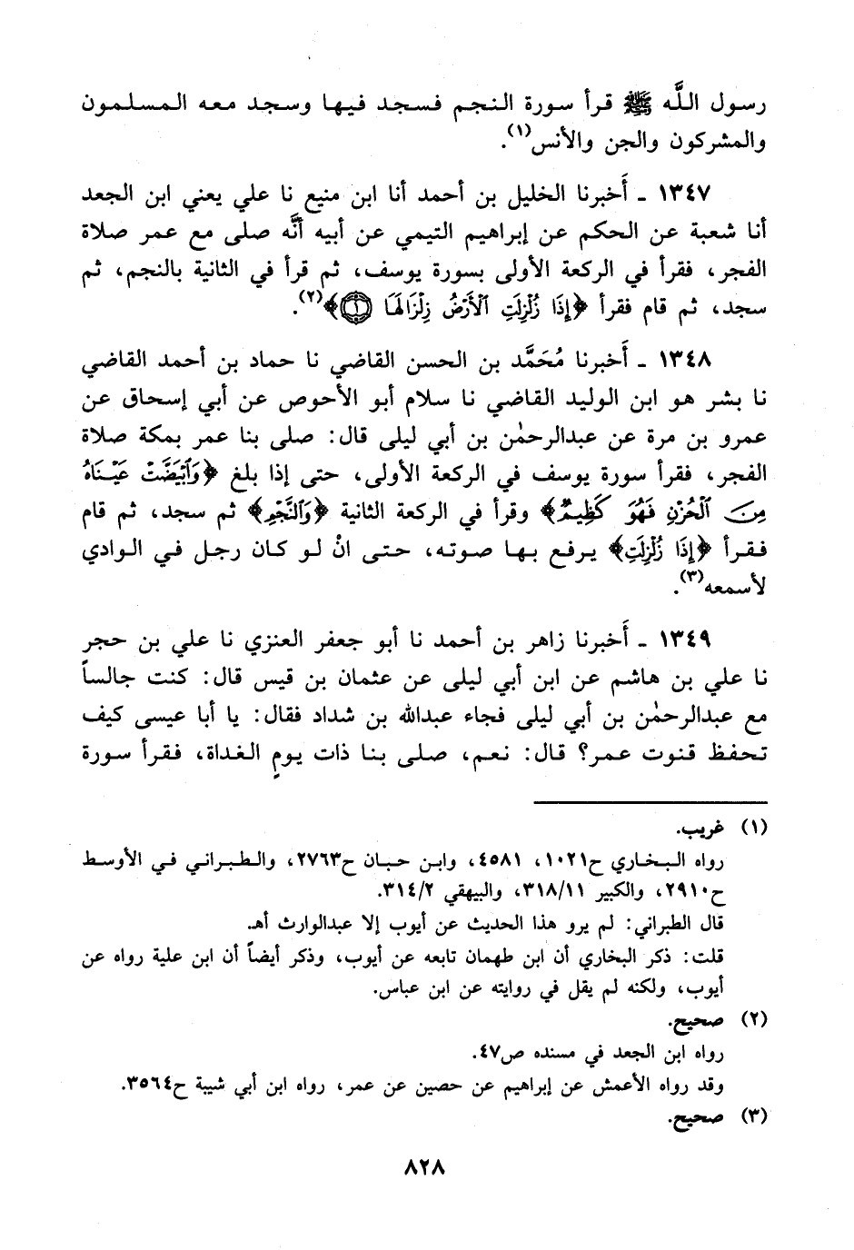1347- أخبرنا الخليل بن أحمد، أَخْبَرَنا ابن منيع، حَدَّثَنا علي يعني ابن الجعد، أَخْبَرَنا شعبة عن الحكم عن إبراهيم التيمي عن أبيه أنه صلى مع عمر صلاة الفجر فقرأ في الركعة الأولى بسورة يوسف ثم قرأ في الثانية بالنجم ثم سجد ثم قام فقرأ {إذا زلزت الأرض زلزالها} .