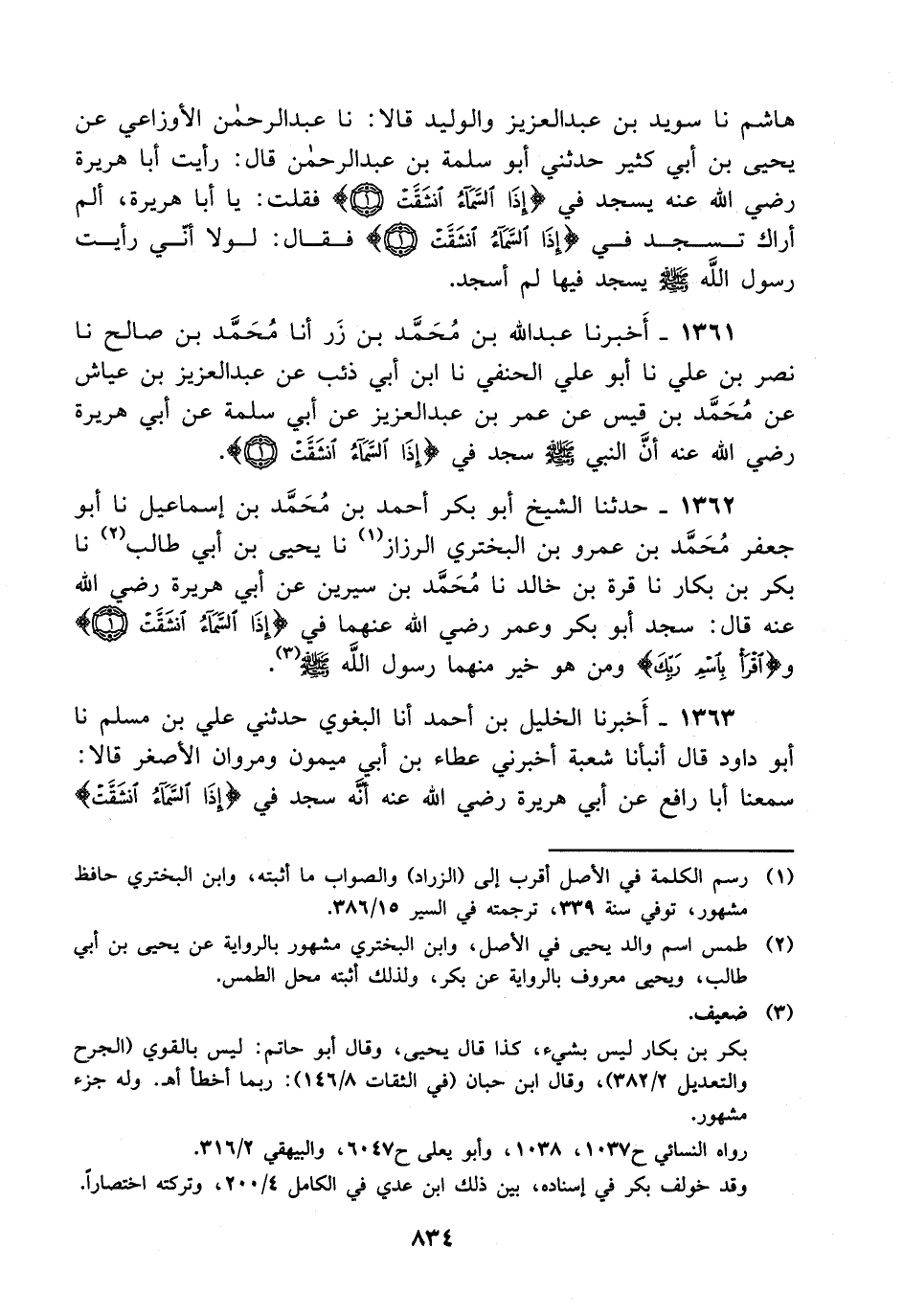 1363- أخبرنا الخليل بن أحمد، أَخْبَرَنا البغوي حدثني علي بن مسلم، حَدَّثَنا أبو داود قال أنبانا شعبة أخبرني عطاء بن أبي ميمون ومروان الأصغر قالا: سمعنا أبا رافع، عَن أبي هريرة رضي الله عنه أنه سجد في {إذا السماء انشقت} -[835]- فقلت له: أتسجد فيها؟ قال: رأيت خليلي صلى الله عليه وسلم يسجد فيها فلا أزال أسجد حتى ألقاه.