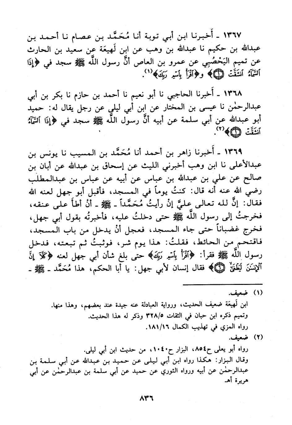 1367- أخبرنا ابن أبي توبة، أَخْبَرَنا مُحَمد بن عصام، حَدَّثَنا أحمد بن عبد الله بن حكيم، حَدَّثَنا عبد الله بن وهب عن ابن لهيعة عن سعيد بن الحارث عن تميم اليحصبي عن عمرو بن العاص أن رسول الله صلى الله عليه وسلم سجد في {إذا السماء انشقت} و {اقرأ باسم ربك} .