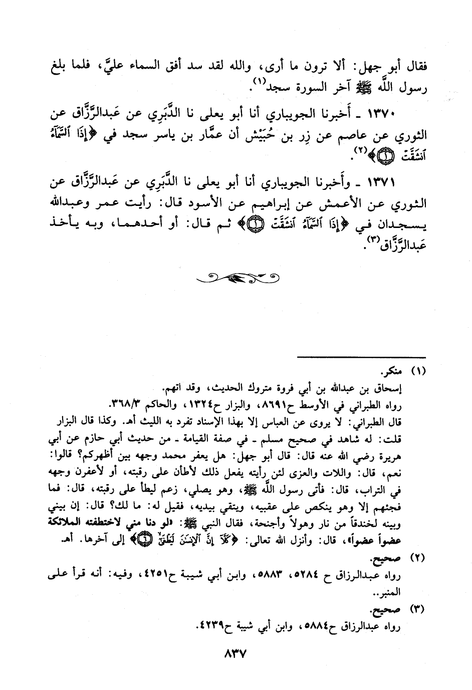 1371- وأخبرنا الجويباري، أخْبَرَنا أبو يعلى، حَدَّثَنا الدبري، عَن عَبد الرزاق عن الثوري عن الأعمش عن إبراهيم عن الأسود قال: رأيت عمر وعبد الله يسجدان في {إذا السماء انشقت} ثم قال: أو أحدهما وبه يأخذ عبد الرزاق.