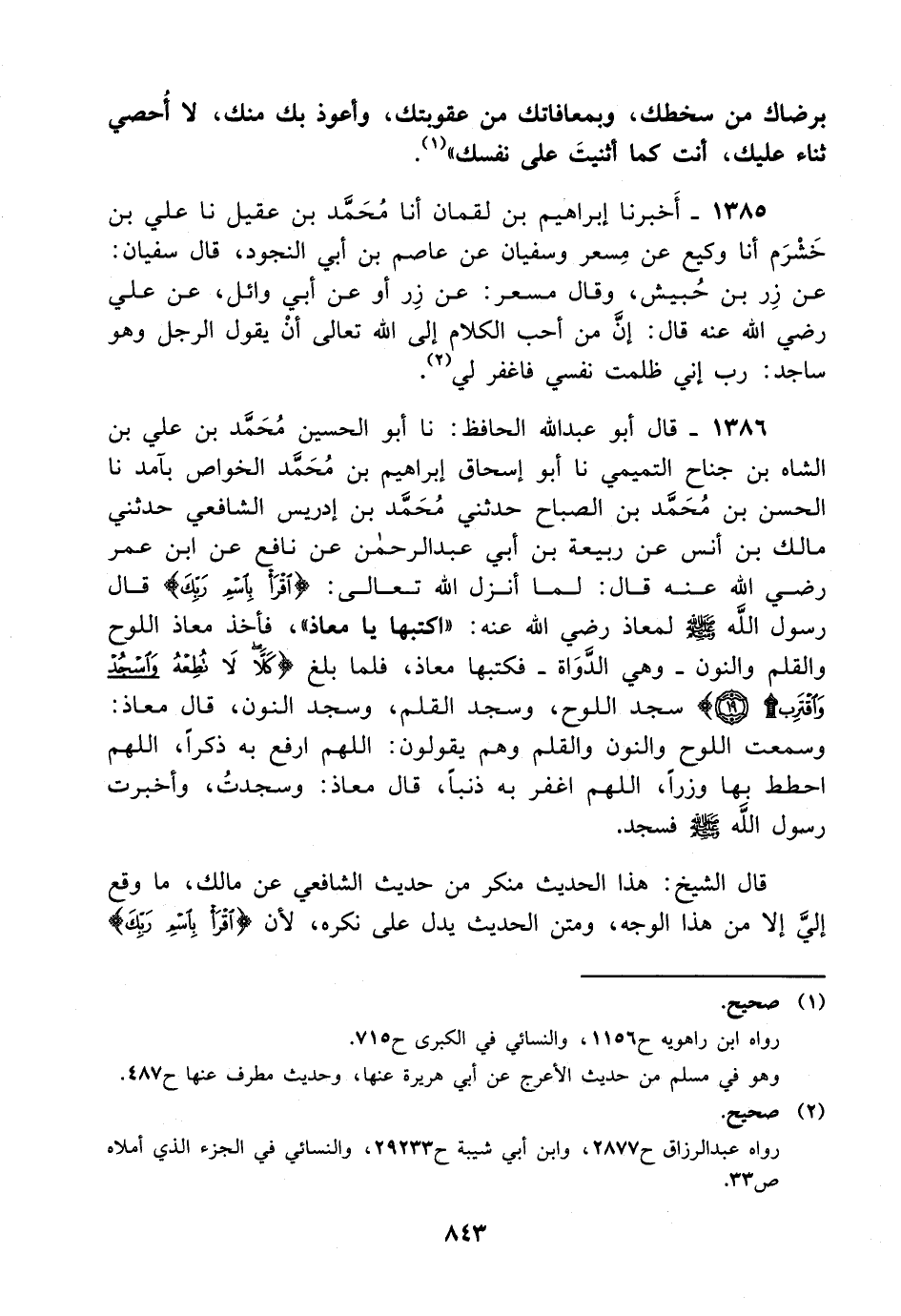 1386- قال أبو عبد الله الحافظ:، حَدَّثَنا أبو الحسين محمد بن علي بن الشاه بن جناح التميمي، حَدَّثَنا أبو إسحاق إبراهيم بن محمد الخواص بآمد، حَدَّثَنا الحسن بن محمد بن الصباح حدثني محمد بن إدريس الشافعي حدثني مالك بن أنس عن ربيعة بن أبي عبد الرحمن عن نافع عن ابن عمر رضي الله عنه قال: لما أنزل الله تعالى: {اقرأ باسم ربك} قال رسول الله صلى الله عليه وسلم لمعاذ رضي الله عنه: اكتبها يامعاذ فأخذ معاذ اللوح والقلم والنون – وهي الدواة – فكتبها معاذ فلما بلغ {كلا لا تطعه واسجد واقترب} سجد اللوح وسجد القلم وسجد النون قال معاذ: وسمعت اللوح والنون والقلم وهم يقولن: اللهم ارفع به ذكرا اللهم احطط بها وزرا اللهم اغفر به ذنبا قال معاذ: وسجدت وأخبرت رسول الله صلى الله عليه وسلم فسجد.