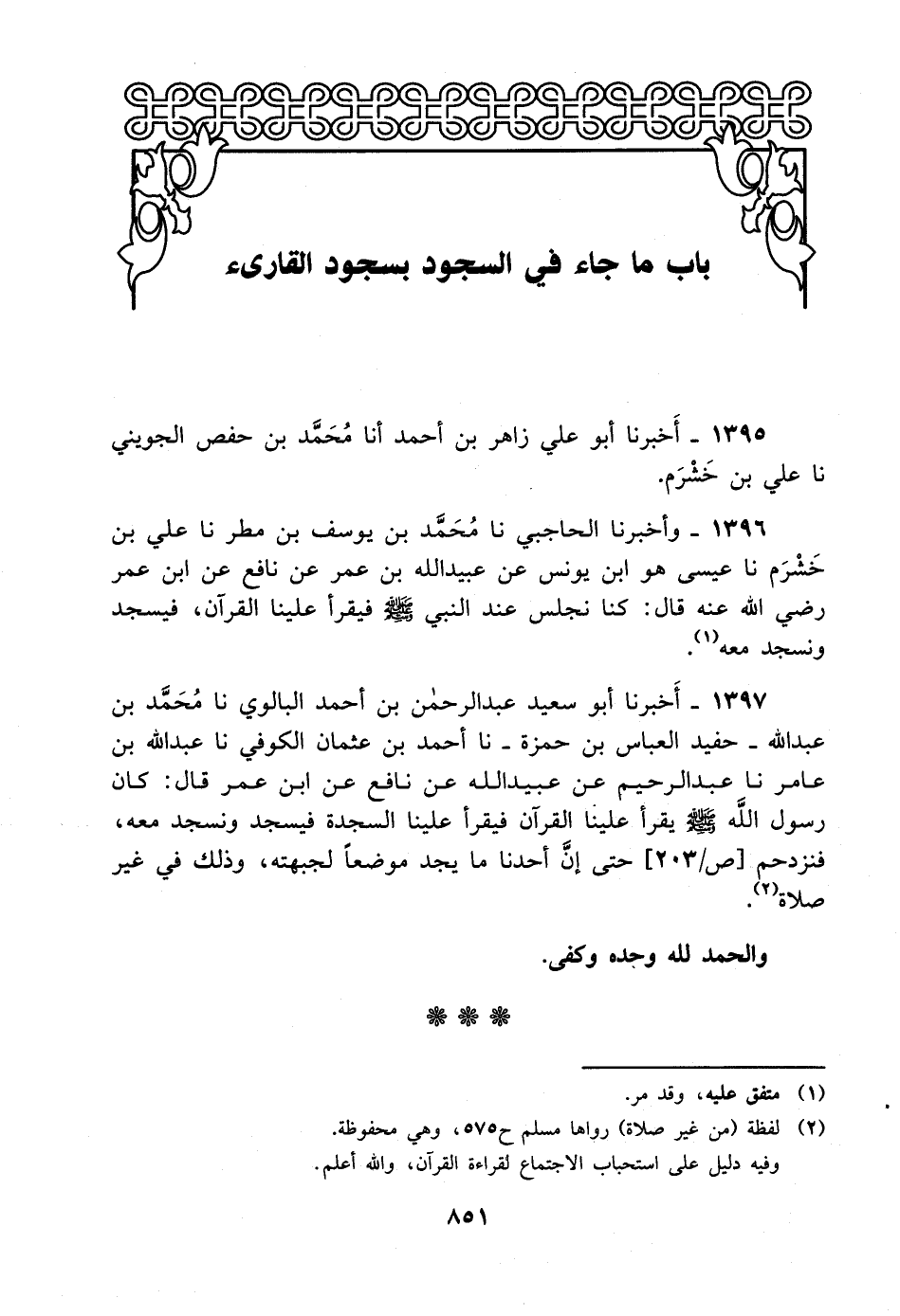 1396- وأخبرنا الحاجبي، حَدَّثَنا محمد بن يوسف بن مطر، حَدَّثَنا علي بن خشرم، حَدَّثَنا عيسى هو ابن يونس عن عبيد الله بن عمر عن نافع عن ابن عمر رضي الله عنه قال: كنا نجلس عند النبي صلى الله عليه وسلم فيقرأ علينا القرآن فيسجد ونسجد معه.