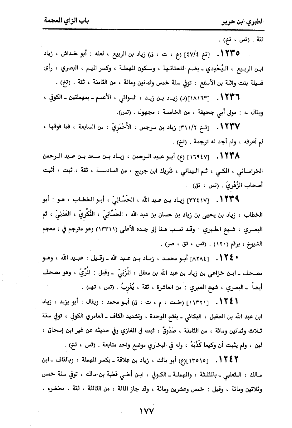 1240 - [8284] أبو محمد، زياد بن عبد الله - وقيل: عبيد الله، وهو مصحف - ابن خزاعي بن زياد بن عبد الله بن معقل، المزني - وقيل: المري، وهو مصحف أيضا - البصري، شيخ الطبري، من العاشرة، ثقة، يغرب. (تس، تهـ).
