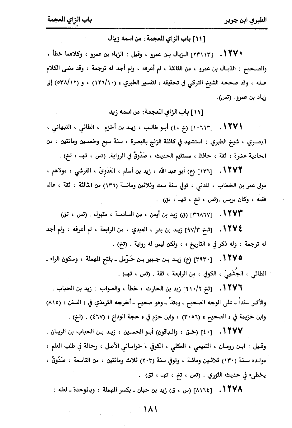 1272 - [136] (ع) أبو عبد الله، زيد بن أسلم، العدوي، القرشي، مولاهم، مولى عمر بن الخطاب، المدني، توفي سنة ست وثلاثين ومائة (136) من الثالثة، ثقة، عالم، فقيه، وكان يرسل. (تس، تخ، تهـ، تق).