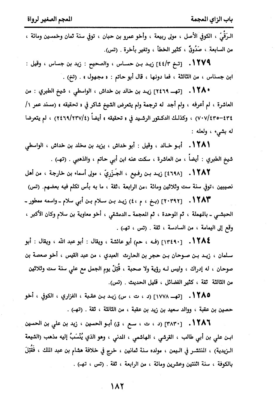 1286 - [3830] (د، ت، سع، ق) أبو الحسين، زيد بن علي بن الحسين بن علي بن أبي طالب، القرشي، الهاشمي، المدني، وهو الذي ينسب إليه مذهب (الشيعة الزيدية) المنتشر في اليمن، مولده سنة ثمانين، خرج في خلافة هشام بن عبد الملك، فقتل بالكوفة سنة اثنتين وعشرين ومائة، من الرابعة، ثقة. (تس، تهـ).