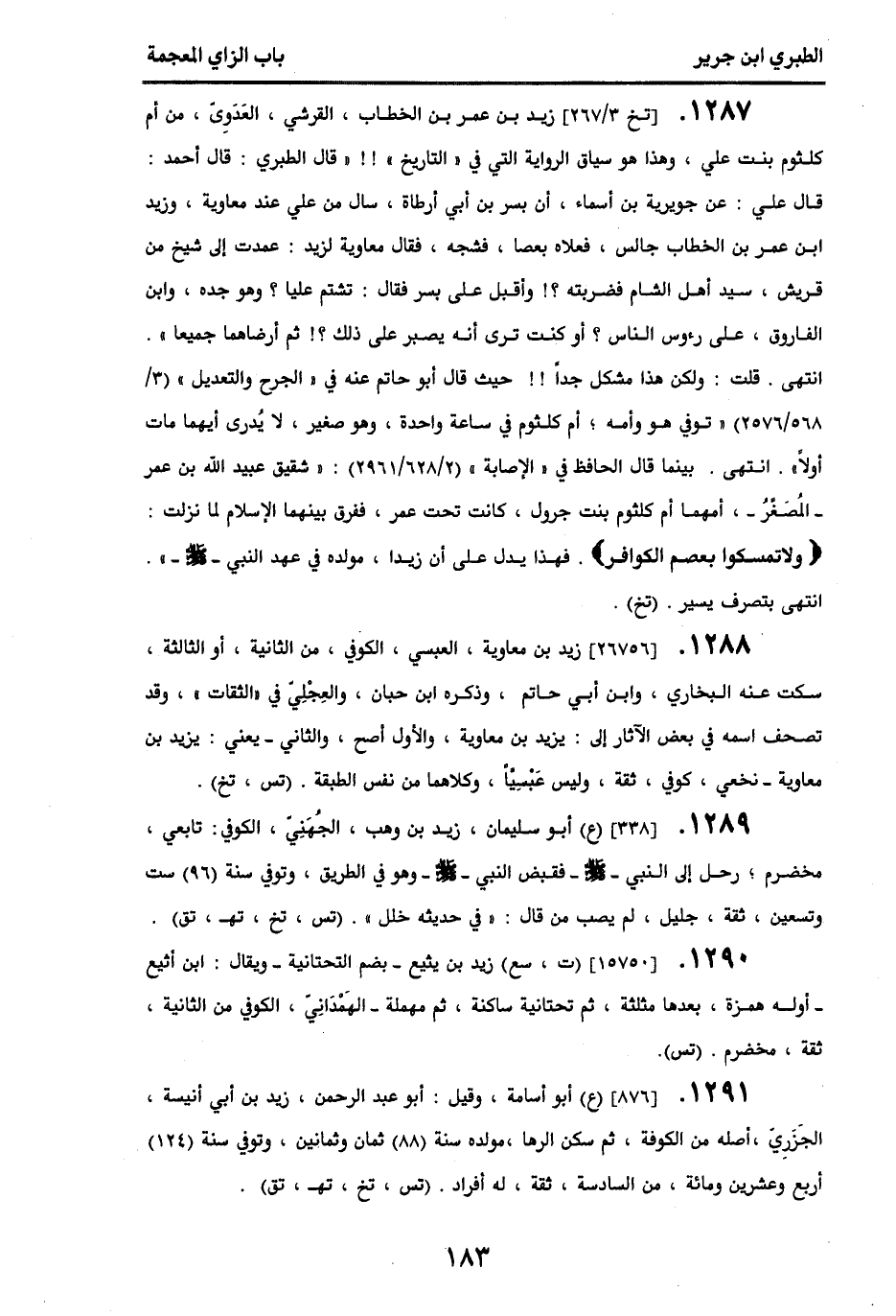 1287 - [تخ 3/ 267] زيد بن عمر بن الخطاب، القرشي، العدوي، من أم كلثوم بنت علي، وهذا هو سياق الرواية التي في " التاريخ "!! قال الطبري: قال أحمد: قال علي: عن جويرية بن أسماء، أن بسر بن أبي أرطاة، نال من علي عند معاوية، وزيد بن عمر بن الخطاب جالس، فعلاه بعصا، فشجه، فقال معاوية لزيد: عمدت إلى شيخ من قريش، سيد أهل الشام فضربته؟! وأقبل على بسر، فقال: تشتم عليا وهو جده وابن الفاروق على رءوس الناس؟ أوكنت ترى أنه يصبر على ذلك؟! ثم أرضاهما جميعا ". انتهى، قلت: ولكن هذا مشكل جدا!! حيث قال أبو حاتم عنه في " الجرح والتعديل " (3/ 568\ 2576): " توفي هو وأمه أم كلثوم في ساعة واحدة، وهو صغير، لا يدرى أيهما مات أولا "، انتهى، بينما قال الحافظ في " الإصابة " (2/ 628\ 2961): " شقيق عبيد الله بن عمر - المصغر -، أمهما أم كلثوم بنت جرول، كانت تحت عمر، ففرق بينهما الإسلام لما نزلت: {ولا تمسكوا بعصم الكوافر}، فهذا يدل على أن زيدا مولده في عهد النبي - صلى الله عليه وسلم - "، انتهى بتصرف يسير. (تخ).