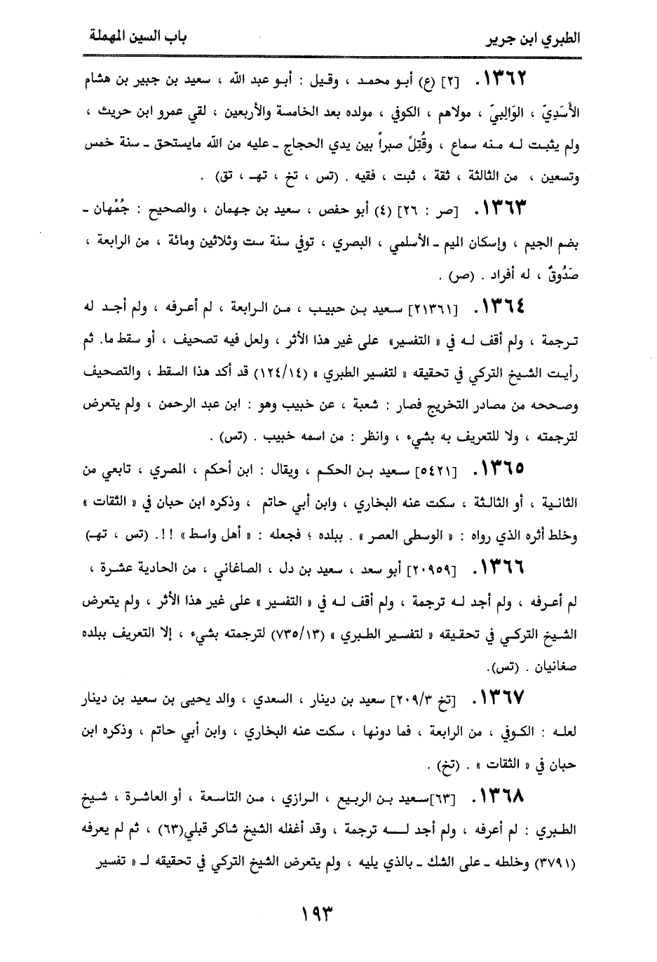 1368 - [63] سعيد بن الربيع، الرازي، من التاسعة أو العاشرة، شيخ الطبري، لم أعرفه، ولم أجد له ترجمة، وقد أغفله الشيخ شاكر قبلي (63)، ثم لم يعرفه (3791) وخلطه - على الشك - بالذي يليه، ولم يتعرض الشيخ التركي في تحقيقه لـ " تفسير