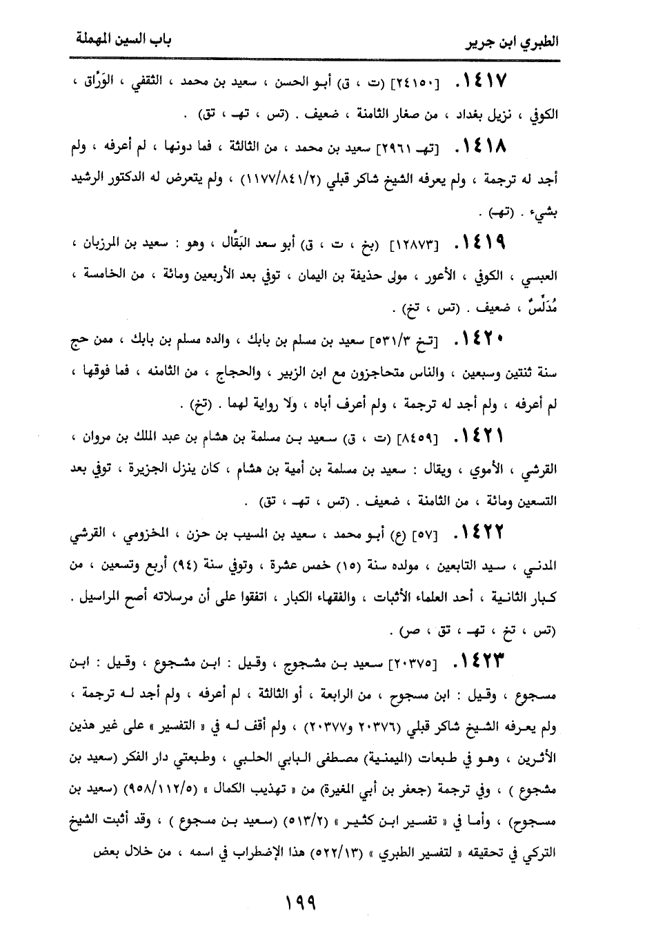 1418 - [تهـ 2961] سعيد بن محمد، من الثالثة فما دونها، لم أعرفه، ولم أجد له ترجمة، ولم يعرفه الشيخ شاكر قبلي (2/ 841\ 1177)، ولم يتعرض له الدكتور الرشيد بشيء. (تهـ).