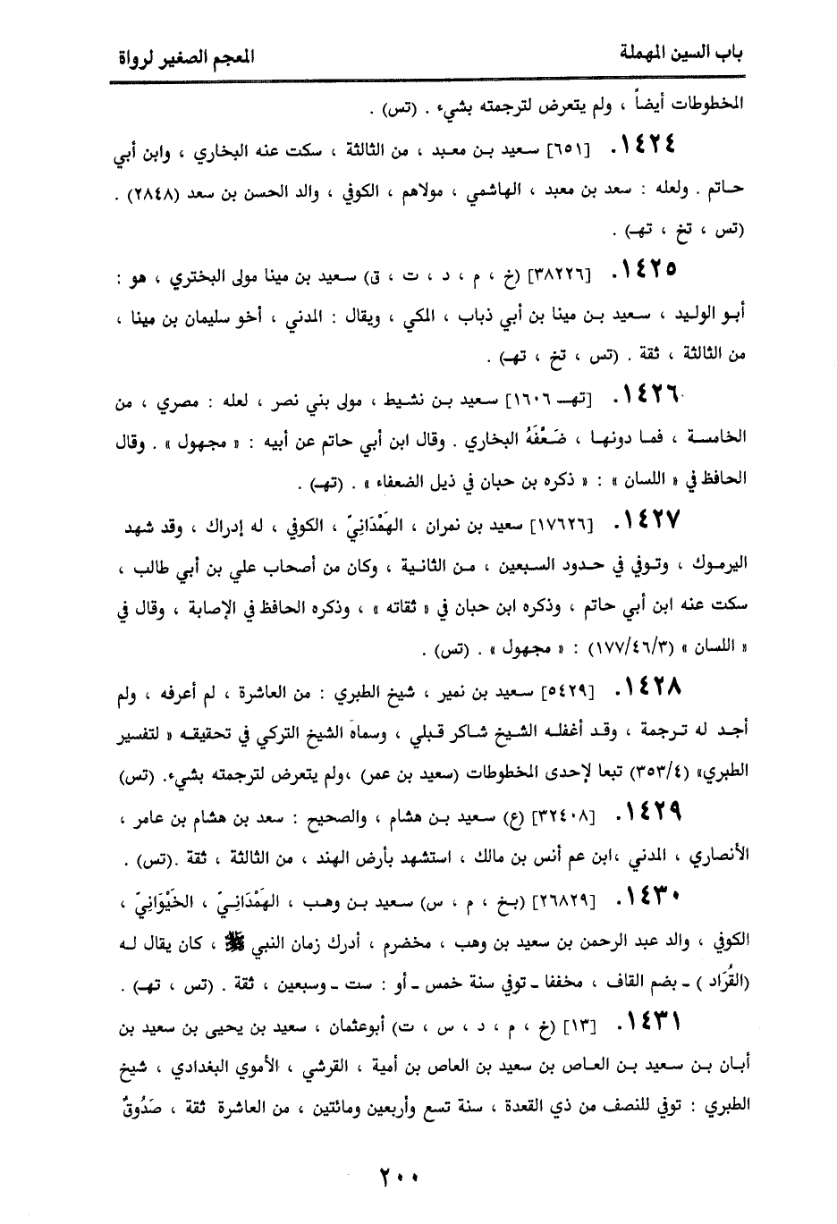 1428 - [5429] سعيد بن نمير، شيخ الطبري، من العاشرة، لم أعرفه، ولم أجد له ترجمة، وقد أغفله الشيخ شاكر قبلي، وسماه الشيخ التركي في تحقيقه " لتفسير الطبري " (4/ 353) تبعا لإحدى المخطوطات (سعيد بن عمر)، ولم يتعرض لترجمته بشيء. (تس).