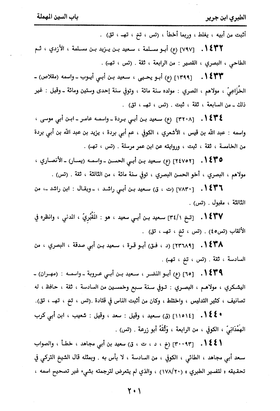 1439 - [65] (ع) أبو النضر، سعيد بن أبي عروبة - واسمه: (مهران) - اليشكري، مولاهم، البصري، توفي سنة سبع وخمسين، من السادسة، ثقة، حافظ، له تصانيف، كثير التدليس، واختلط، وكان من أثبت الناس في قتادة. (تس، تخ، تهـ، تق).