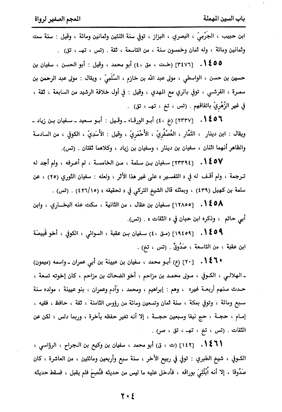 1460 - [20] (ع) أبو محمد، سفيان بن عيينة بن أبي عمران - واسمه (ميمون) - الهلالي، الكوفي، مولى محمد بن مزاحم، أخو الضحاك بن مزاحم، كان إخوته تسعة، حدث منهم أربعة غيره، وهم: إبراهيم، ومحمد، وآدم، وعمران، بنو عيينة، مولده سنة سبع ومائة، وتوفي بمكة، سنة ثمان وتسعين ومائة، من رؤوس الثامنة، ثقة، حافظ، فقيه، إمام، حجة، حج نيفا وسبعين حجة، إلا أنه تغير حفظه بأخرة، وربما دلس لكن عن الثقات. (تس، تخ، تهـ، تق، صر).