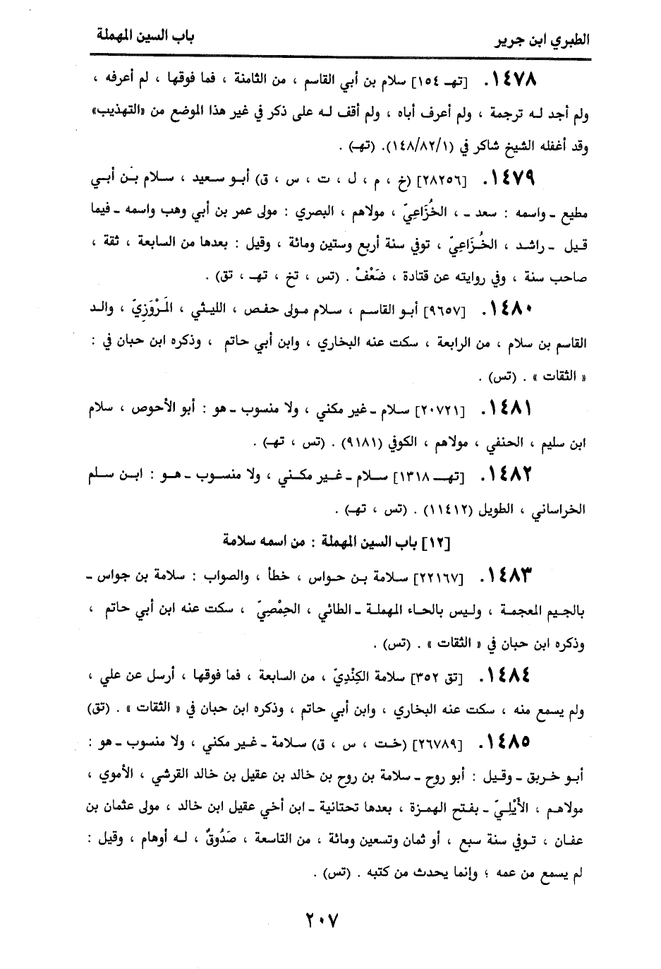 1478 - [تهـ 154] سلام بن أبي القاسم، من الثامنة فما فوقها، لم أعرفه، ولم أجد له ترجمة، ولم أعرف أباه، ولم أقف له على ذكر في غير هذا الموضع من " التهذيب "، وقد أغفله الشيخ شاكر في (1/ 82\ 148). (تهـ).