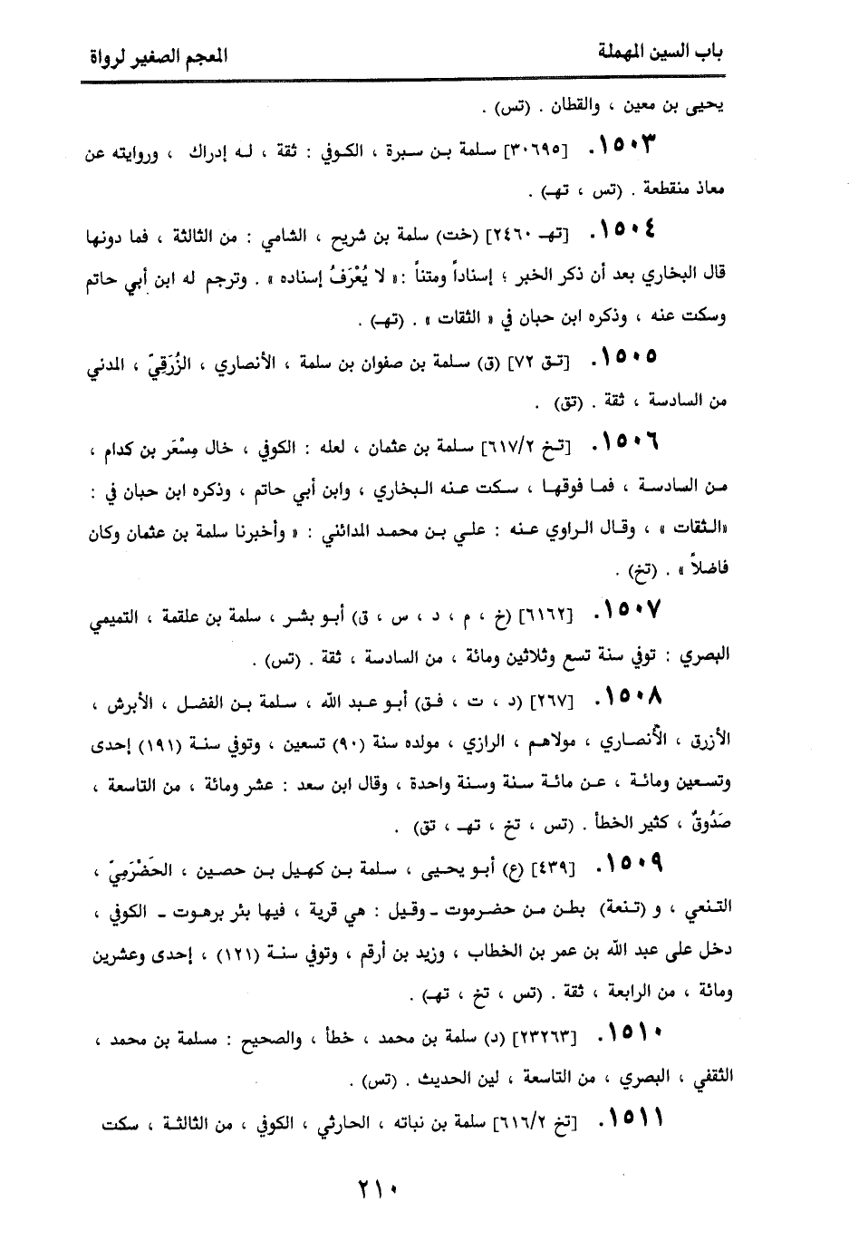 1506 - [تخ 2/ 617] سلمة بن عثمان، لعله الكوفي، خال مسعر بن كدام، من السادسة فما فوقها، سكت عنه البخاري، وابن أبي حاتم، وذكره ابن حبان في " الثقات "، وقال الراوي عنه علي بن محمد المدائني: " وأخبرنا سلمة بن عثمان وكان فاضلا ". (تخ).