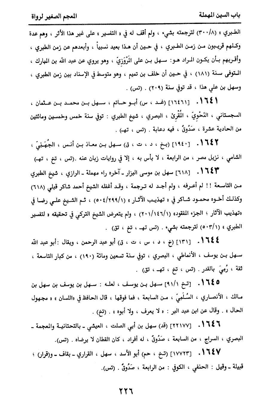 1641 - [16461] (غد، س) أبو حاتم، سهل بن محمد بن عثمان، السجستاني، النحوي، المقرئ، البصري، شيخ الطبري، توفي سنة خمس وخمسين ومائتين من الحادية عشرة، صدوق، فيه دعابة. (تس، تهـ).