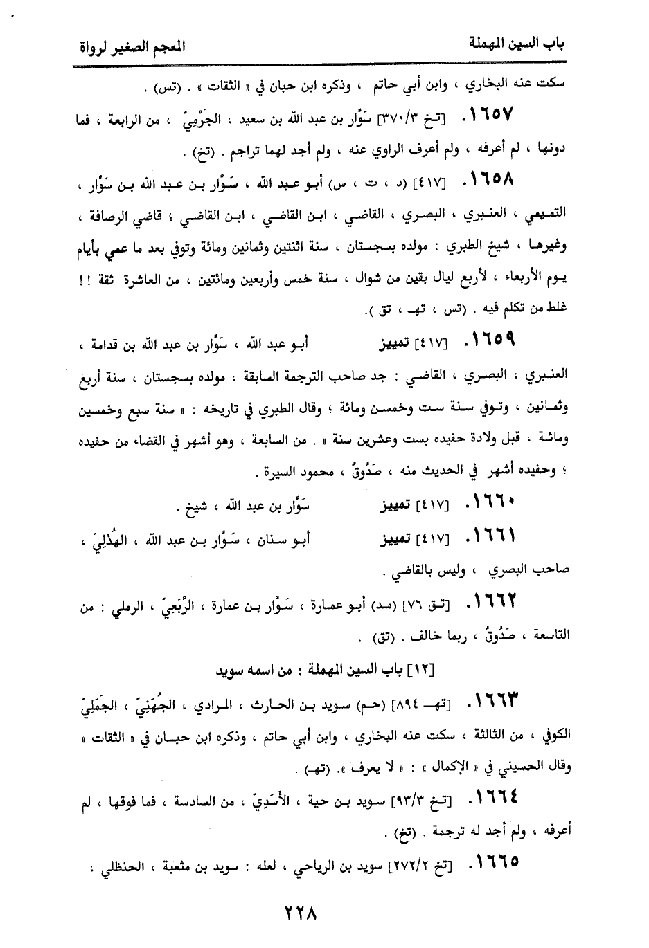 1657 - [تخ 3/ 370] سوار بن عبد الله بن سعيد، الجرمي، من الرابعة فما دونها، لم أعرفه، ولم أعرف الراوي عنه، ولم أجد لهما تراجم. (تخ).
