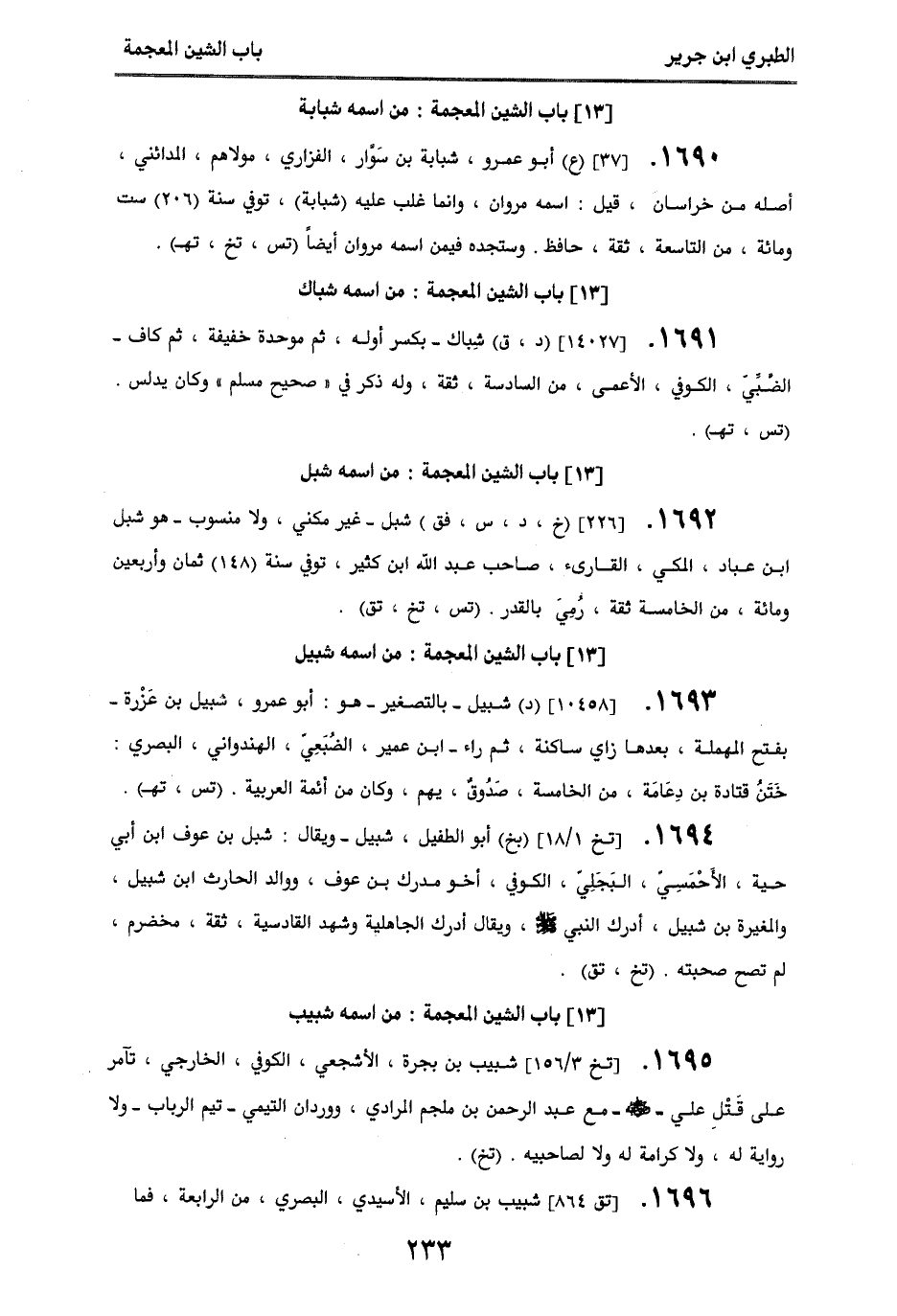 1692 - [226] (خ، د، س، فق) شبل - غير مكني ولا منسوب - هو شبل بن عباد، المكي، القارئ، صاحب عبد الله بن كثير، توفي سنة (148) ثمان وأربعين ومائة، من الخامسة ثقة، رمي بالقدر. (تس، تخ، تق).