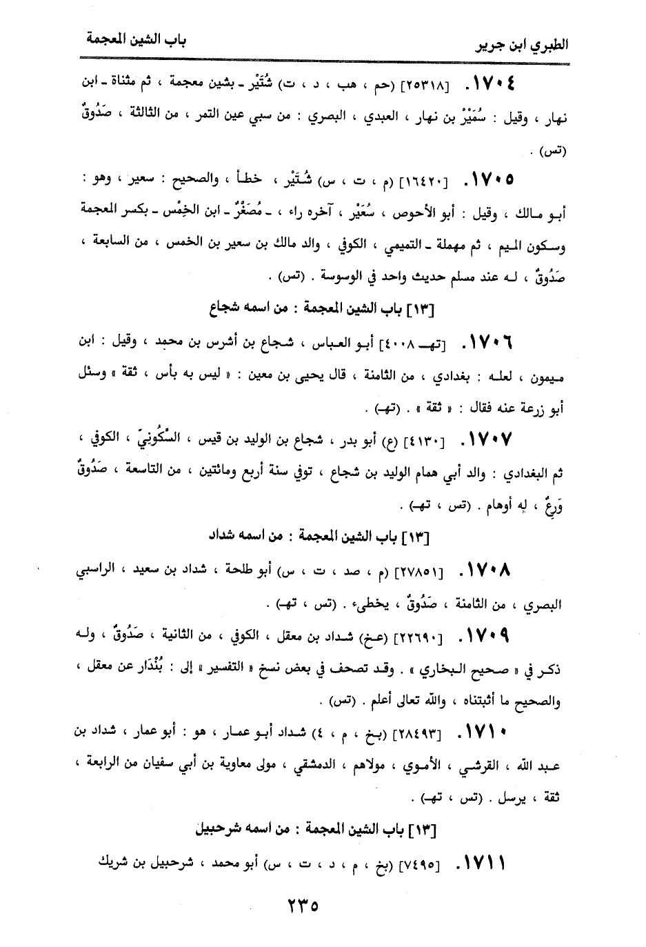 1705 - [16420] (م، ت، س) شتير، خطأ، والصحيح، سعير، وهو أبو مالك، وقيل: أبو الأحوص، سعير - آخره راء، مصغر - ابن الخمس - بكسر المعجمة، وسكون الميم، ثم مهملة - التميمي، الكوفي، والد مالك بن سعير بن الخمس، من السابعة، صدوق، له عند مسلم حديث واحد في الوسوسة. (تس).