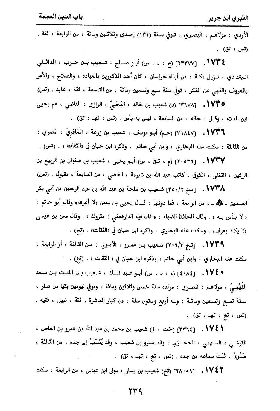1741 - [3364] (خت، 4) شعيب بن محمد بن عبد الله بن عمرو بن العاص، القرشي، السهمي، الحجازي، والد عمرو بن شعيب، وقد ينسب إلى جده، من الثالثة، صدوق، ثبت سماعه من جده. (تس، تخ، تهـ، تق).