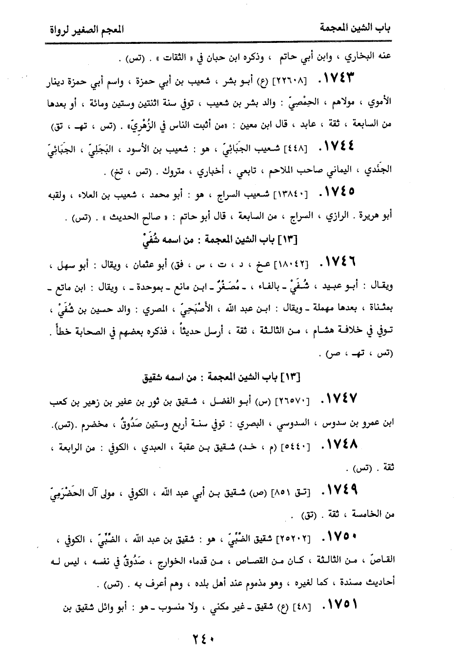 1744 - [448] شعيب الجبائي، هو شعيب بن الأسود، البجلي، الجبائي، الجندي، اليماني، صاحب الملاحم، تابعي، أخباري، متروك. (تس، تخ).