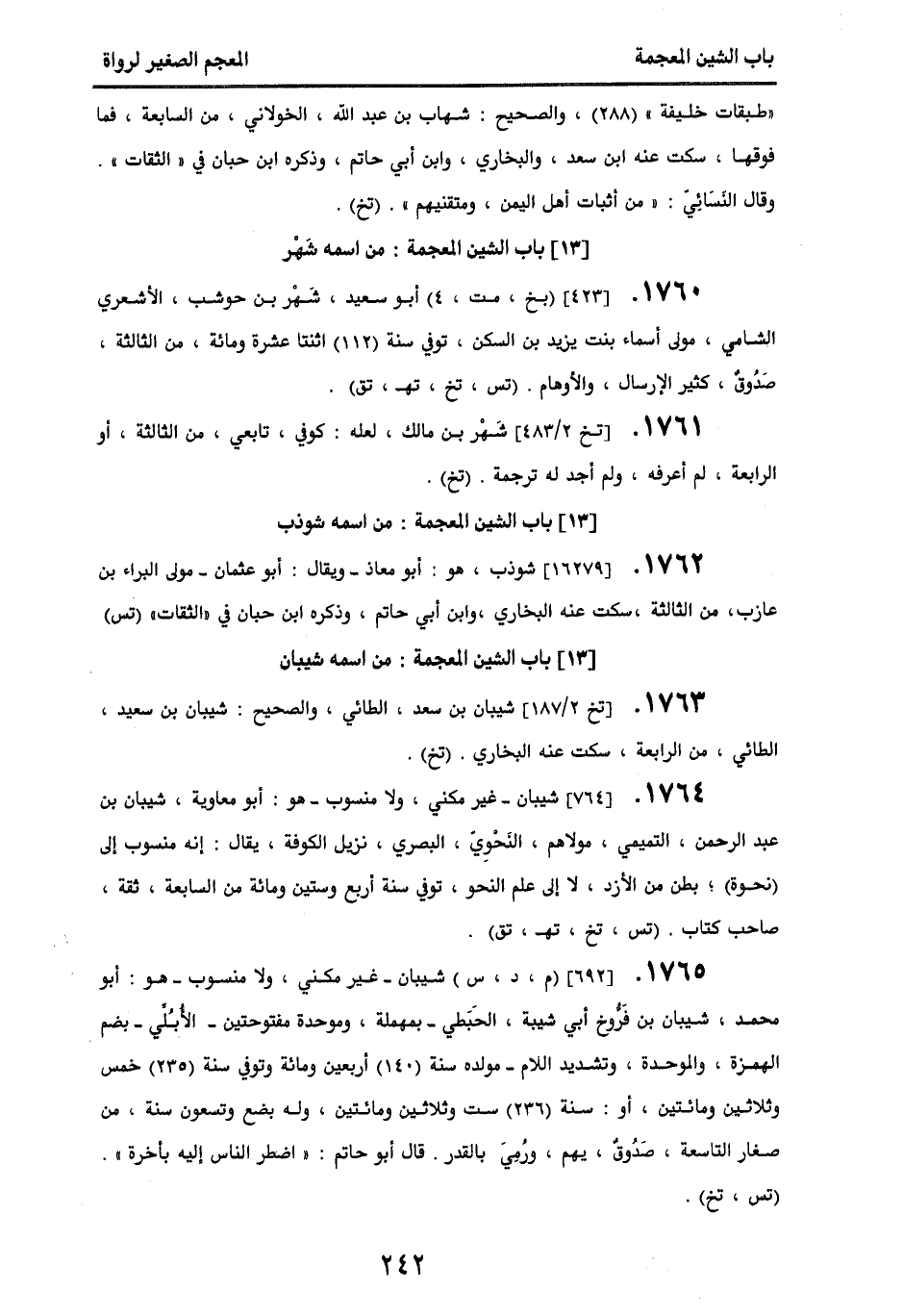 1764 - [764] شيبان - غير مكني ولا منسوب - هو أبو معاوية، شيبان بن عبد الرحمن، التميمي، مولاهم، النحوي، البصري، نزيل الكوفة، يقال: إنه منسوب إلى (نحوة)؛ بطن من الأزد، لا إلى علم النحو، توفي سنة أربع وستين ومائة من السابعة، ثقة، صاحب كتاب. (تس، تخ، تهـ، تق).