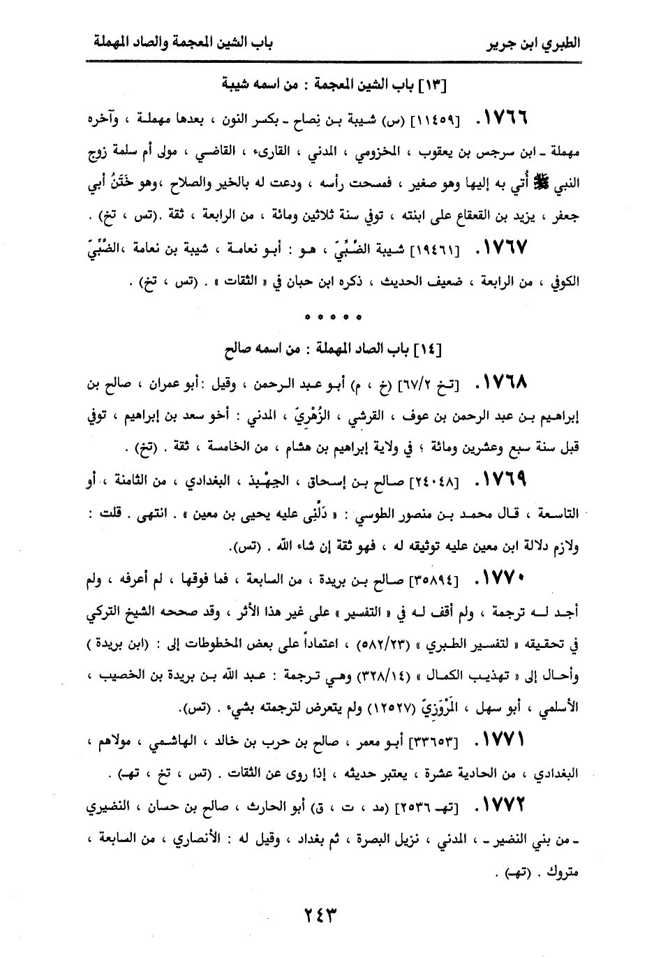 1770 - [35894] صالح بن بريدة، من السابعة فما فوقها، لم أعرفه، ولم أجد له ترجمة، ولم أقف له في " التفسير " على غير هذا الأثر، وقد صححه الشيخ التركي في تحقيقه " لتفسير الطبري " (23/ 582)، اعتمادا على بعض المخطوطات إلى: (ابن بريدة) وأحال إلى " تهذيب الكمال " (14/ 328) وهي ترجمة: عبد الله بن بريدة بن الخصيب، الأسلمي، أبو سهل، المروزي (12527) ولم يتعرض لترجمته بشيء. (تس).