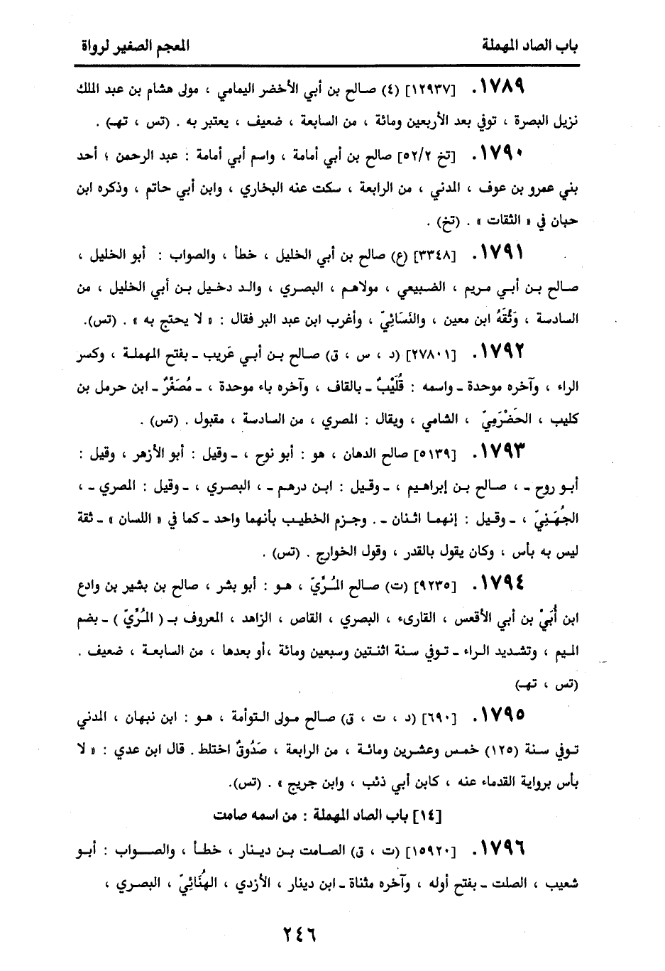 1790 - [تخ 2/ 52] صالح بن أبي أمامة، واسم أبي أمامة عبد الرحمن، أحد بني عمرو بن عوف، المدني، من الرابعة، سكت عنه البخاري، وابن أبي حاتم، وذكره ابن حبان في " الثقات ". (تخ).