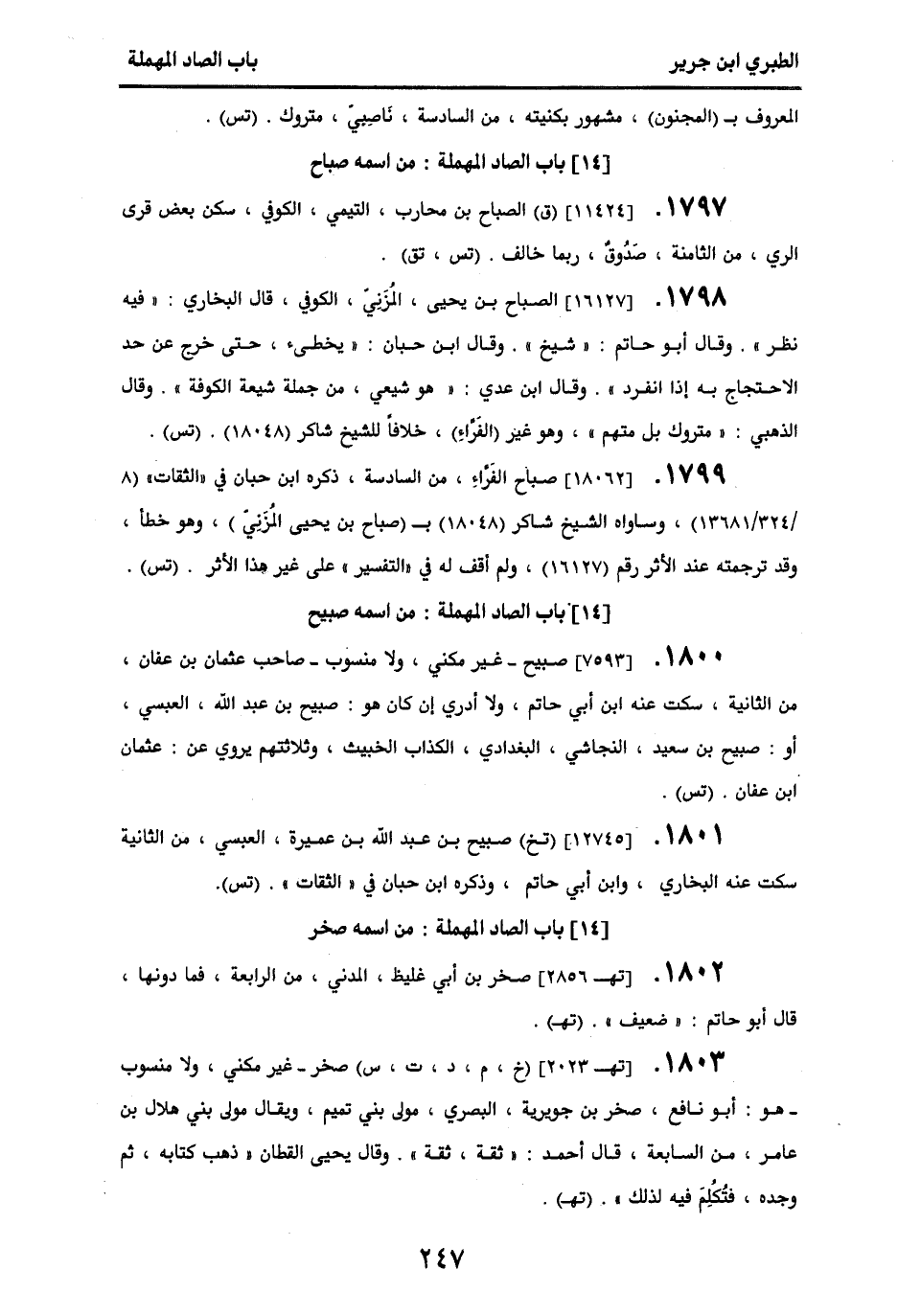 1797 - [11424] (ق) الصباح بن محارب، التيمي، الكوفي، سكن بعض قرى الري، من الثامنة، صدوق، ربما خالف. (تس، تق).