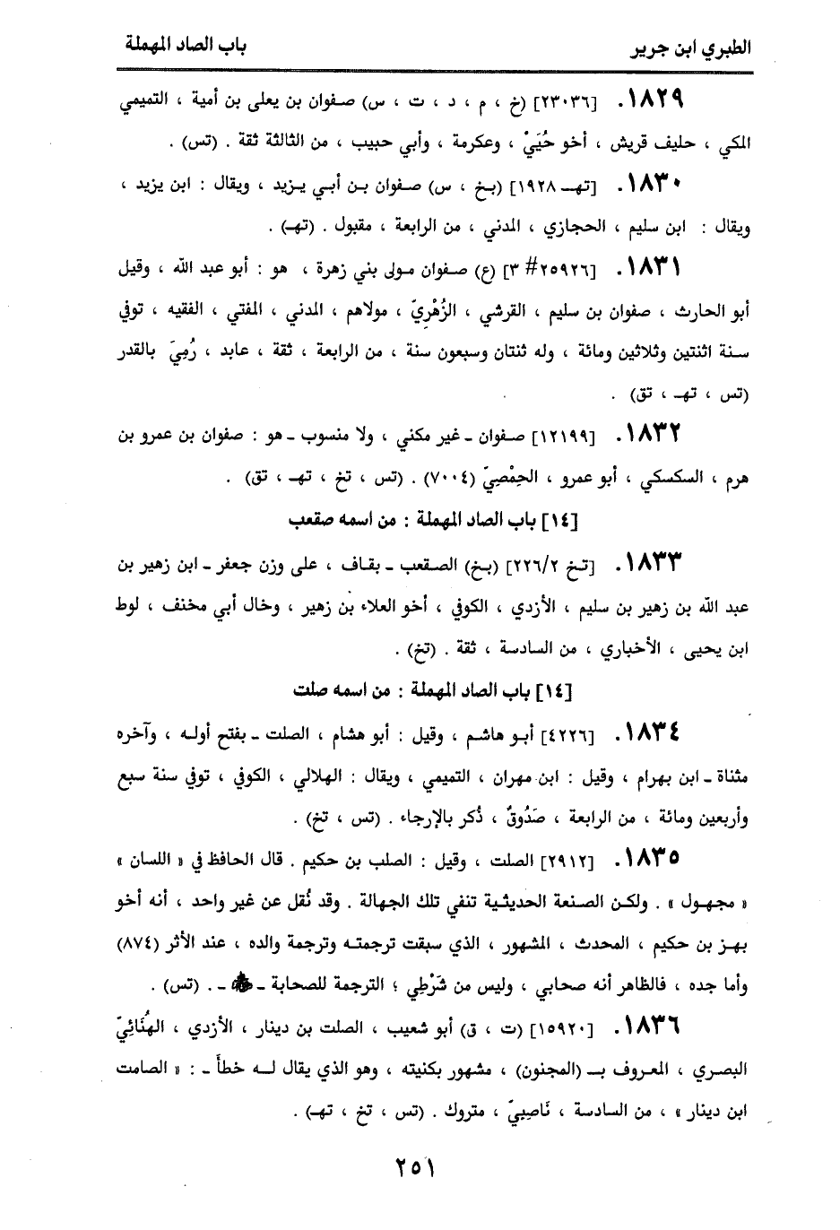 1831 - [25926 3] (ع) صفوان مولى بني زهرة، هو أبو عبد الله، وقيل أبو الحارث، صفوان بن سليم، القرشي، الزهري، مولاهم، المدني، المفتي، الفقيه، توفي سنة اثنتين وثلاثين ومائة، وله ثنتان وسبعون سنة، من الرابعة، ثقة، عابد، رمي بالقدر (تس، تهـ، تق).