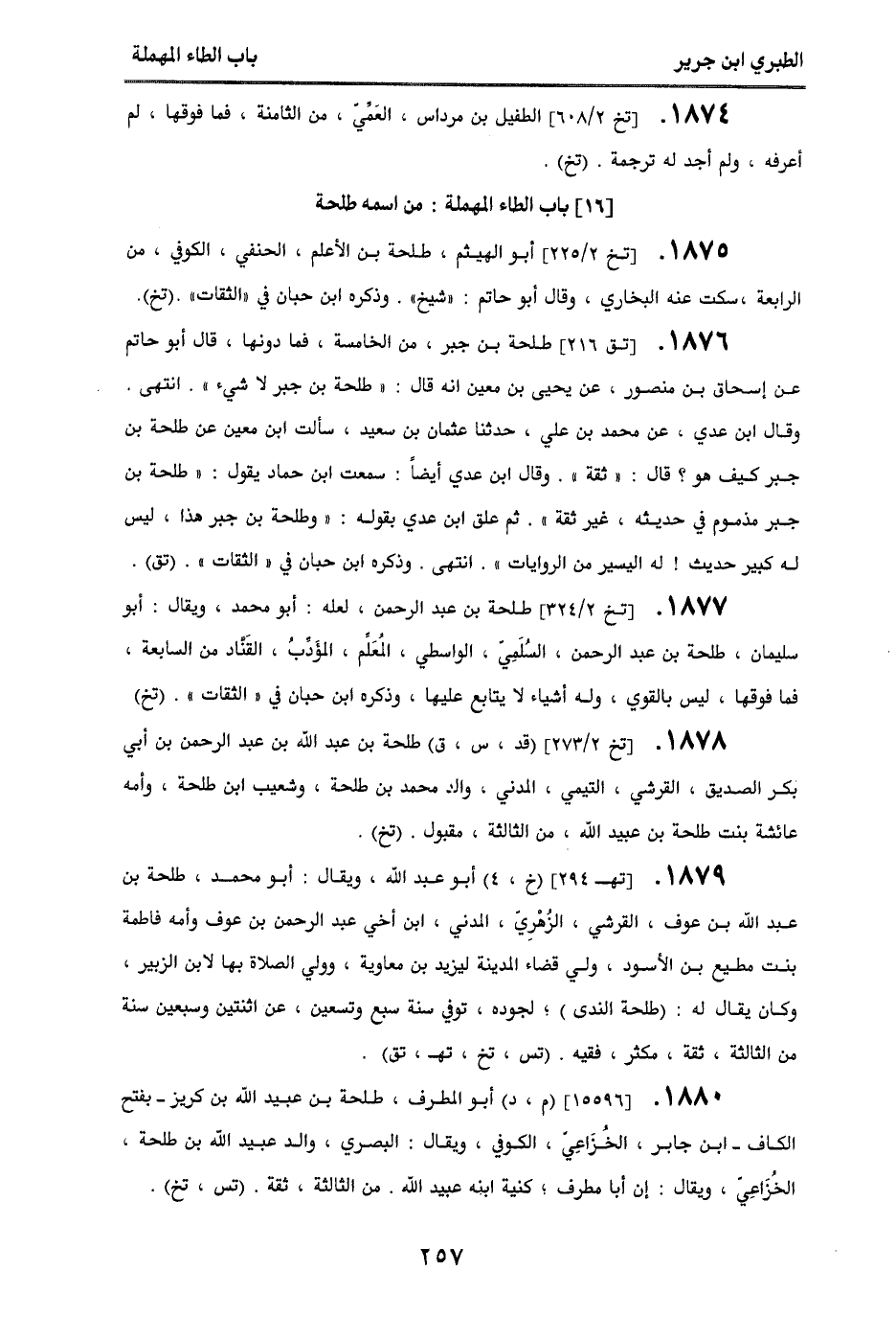 1876 - [تق 216] طلحة بن جبر، من الخامسة فما دونها، قال أبو حاتم عن إسحاق بن منصور، عن يحيى بن معين أنه قال: " طلحة بن جبر لا شيء ". انتهى، وقال ابن عدي: عن محمد بن علي، حدثنا عثمان بن سعيد، سألت ابن معين، عن طلحة بن جبر كيف هو؟ قال: " ثقة "، وقال ابن عدي أيضا: سمعت ابن حماد يقول: " طلحة بن جبر مذموم في حديثه، غير ثقة "، ثم علق ابن عدي بقوله: " وطلحة بن جبر هذا ليس له كبير حديث! له اليسير من الروايات ". انتهى. وذكره ابن حبان في " الثقات ". (تق).