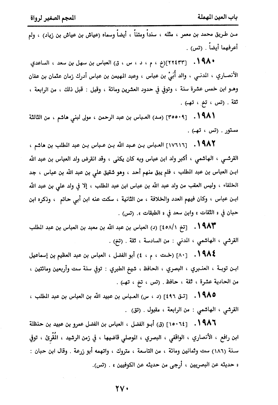 1983 - [تخ 1/ 458] (د) العباس بن عبد الله بن معبد بن العباس بن عبد المطلب القرشي، الهاشمي، المدني، من السادسة، ثقة. (تخ).